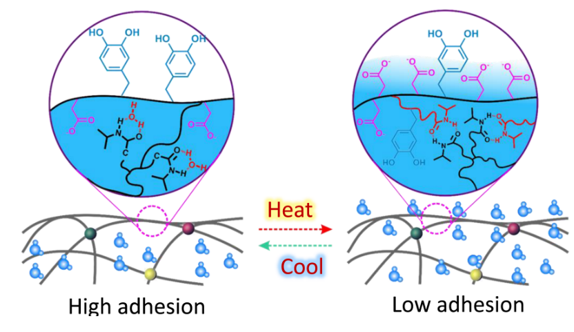 這項突破并非一蹴而就。周峰回憶,幾年前,團(tuán)隊一直攻關(guān)高強韌黏附水凝膠材料,偶然發(fā)現(xiàn)一種材料在多次按壓后黏性驟降?!霸摤F(xiàn)象引發(fā)了我們的極大興趣,經(jīng)過對材料的成分分析、機(jī)理驗證等,才知道原來在多次按壓以后,手部溫度傳遞到凝膠表面,致使凝膠發(fā)生相變,呈現(xiàn)低黏附態(tài)?!边@讓團(tuán)隊意識到,溫度可能是調(diào)控黏附性能的鑰匙。