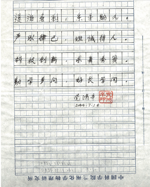 他將這32個(gè)字寫(xiě)完,或許覺(jué)得筆跡太單薄、不夠清楚,他又顫顫巍巍地拿起筆,緩慢而用力地又描了一遍,連一個(gè)標(biāo)點(diǎn)符號(hào)都不忽略,最后鄭重地簽上了自己的名字,并加蓋了自己的私章??吹酱饲榇司?,來(lái)探望他的領(lǐng)導(dǎo)和學(xué)生無(wú)比感慨,無(wú)不動(dòng)容。寶貴的遺訓(xùn)彰顯著他嚴(yán)以律己、嚴(yán)謹(jǐn)治學(xué)、誠(chéng)信科研、淡泊名利的崇高品格,他的風(fēng)范將長(zhǎng)存于世,激勵(lì)著后來(lái)者。