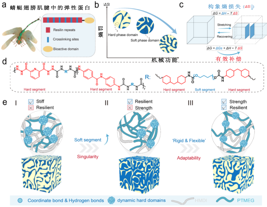團隊從分子層面動手:先在聚氨酯分子里引入動態(tài)氫鍵和配位鍵,像在分子內(nèi)部埋了“魔術(shù)拉鏈”,它們既能牢牢固定硬域的形狀,又能在拉伸時自動解鎖。當材料受到外力拉伸時,硬域先分解,釋放了分子鏈的“自由度”,熵增加(形變?nèi)菀祝慌c此同時,柔軟的鏈段會有序結(jié)晶,吸收能量,焓降低(彈性增強);這種能量的“此消彼長”讓材料變得又強又彈,一舉打破了“熵罰”難題。