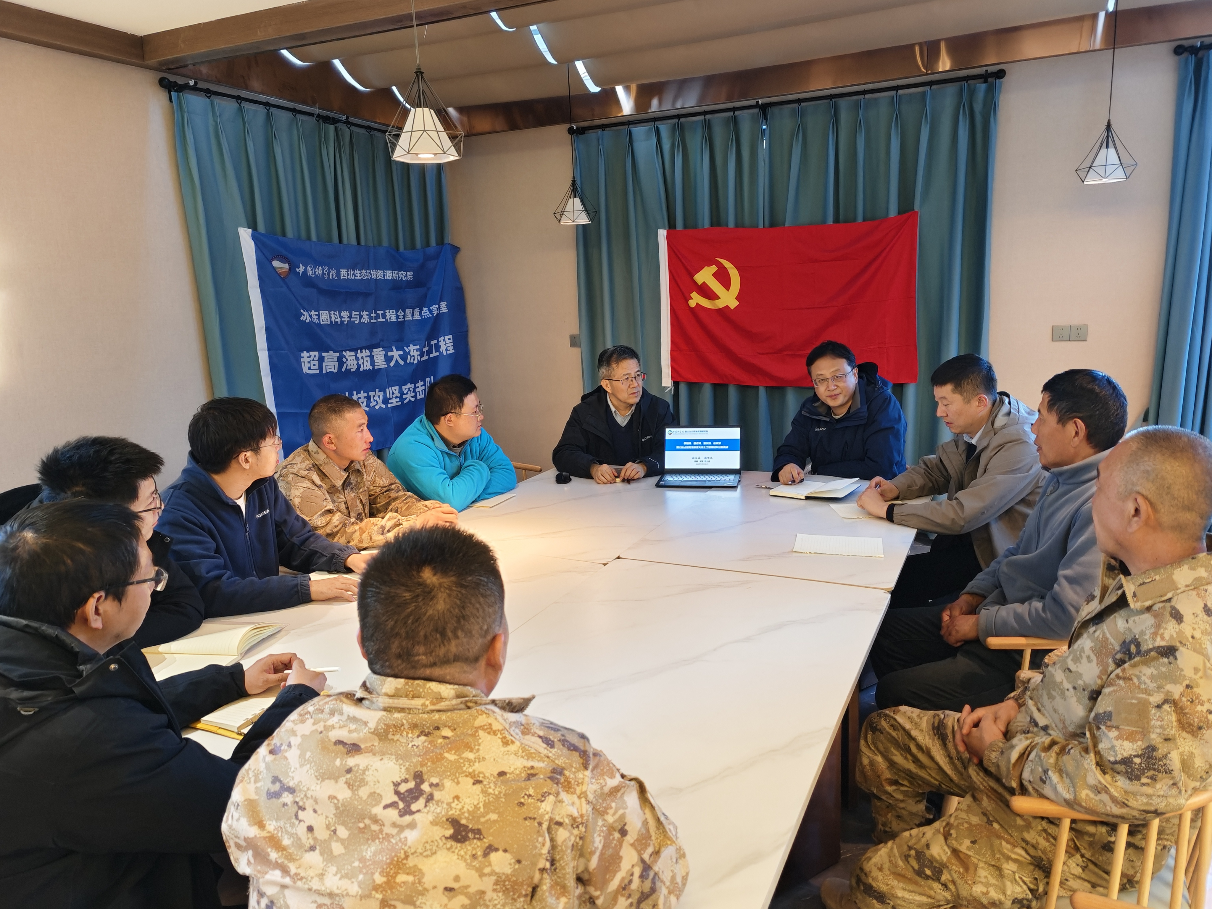 調研中,突擊隊召開了黨員擴大會議。張長春代表黨委和領導班子向在超高海拔艱苦條件下,不畏艱辛、堅持工作的突擊隊隊員表達慰問和關心,并作“學精神、強作風、重實踐、建新功、努力搶占超高海拔重大凍土工程領域科技制高點”的專題報告。他指出,面向國家在重大凍土工程領域的迫切需求,突擊隊克服高原缺氧、身體不適等困難,傳承缺氧不缺精神的優(yōu)秀傳統(tǒng),勇攀科技高峰,體現(xiàn)了新時代科研工作者的優(yōu)良作風和攻關精神。下一步要在現(xiàn)有觀測研究的基礎上,積極做好重大任務的爭取和組織實施,在服務國家重大工程建設中再立新功。同時,他叮囑突擊隊員在野外工作中,一定要保重身體、適當休息,確??蒲泄ぷ骱腿松戆踩?。