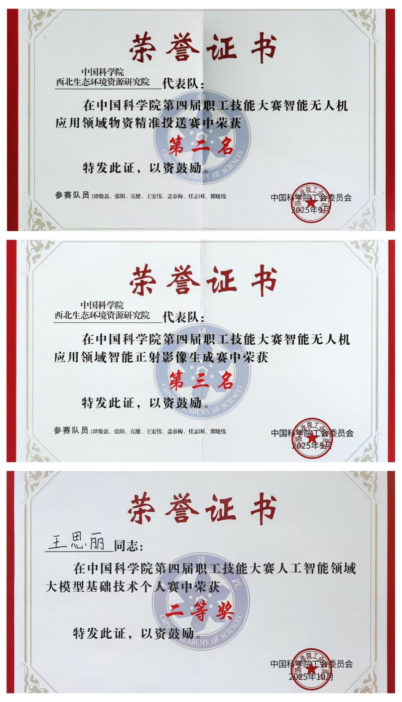 在西北研究院黨委的高度重視與工會的精心組織下,科研團(tuán)隊積極響應(yīng)、踴躍參賽。智能無人機應(yīng)用領(lǐng)域,由黑河遙感試驗研究站譚俊磊、亢健、張陽等6名選手組成的團(tuán)隊通過精準(zhǔn)路徑規(guī)劃與動態(tài)負(fù)載調(diào)控,實現(xiàn)復(fù)雜環(huán)境下物資的穩(wěn)定投送,依托自研靶標(biāo)識別程序,顯著提升正射影像數(shù)據(jù)處理效率,榮獲了“物資精準(zhǔn)投送”賽道全院第二名,“智能正射影像生成”賽道全院第三名和團(tuán)隊三等獎。在網(wǎng)信智能應(yīng)用服務(wù)領(lǐng)域,國家冰川凍土沙漠科學(xué)數(shù)據(jù)中心團(tuán)隊將專業(yè)領(lǐng)域數(shù)據(jù)和服務(wù)能力與AI的強大分析推理能力結(jié)合,實現(xiàn)自然語言交互、數(shù)據(jù)智能分析和可視化展示,提升了數(shù)據(jù)中心的智能化服務(wù)水平,榮獲了“MCP云服務(wù)”賽道三等獎。在人工智能領(lǐng)域,文獻(xiàn)情報中心王思麗基于中國科學(xué)院 “磐石?科學(xué)基礎(chǔ)大模型”,圍繞人工智能基礎(chǔ)理論、實操能力與知識融合推理能力展開角逐,榮獲“大模型基礎(chǔ)技術(shù)個人賽”二等獎。
