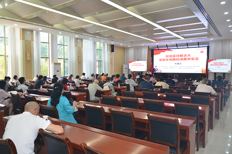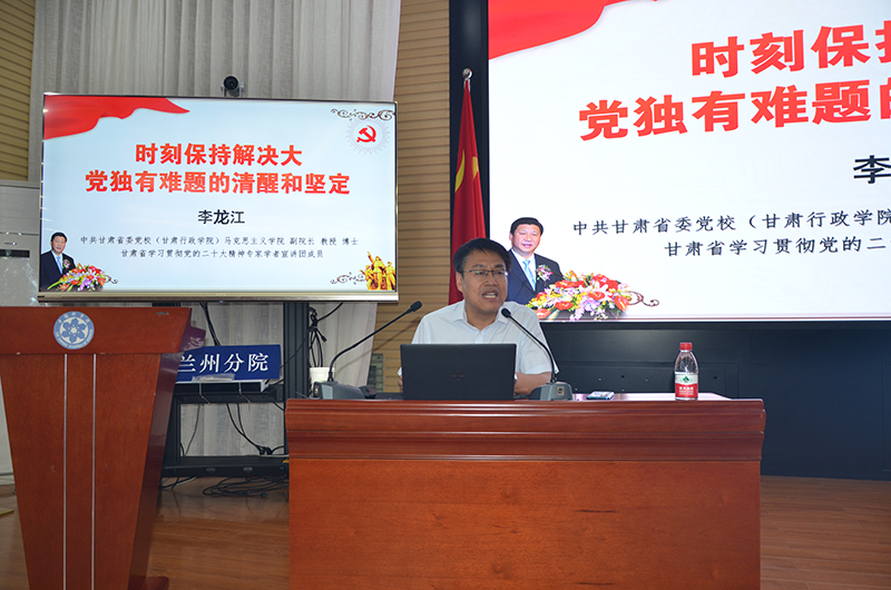 會(huì)議邀請(qǐng)了甘肅省委黨校馬克思主義學(xué)院副院長(zhǎng)李龍江教授作《時(shí)刻保持解決大黨獨(dú)有難題的清醒和堅(jiān)定》專題輔導(dǎo)報(bào)告。報(bào)告圍繞“把握大黨獨(dú)有難題的原因和表現(xiàn)”“明確提出大黨獨(dú)有難題的重大意義”“總結(jié)解決大黨獨(dú)有難題的歷史經(jīng)驗(yàn)”“以自我革命精神破解大黨獨(dú)有難題”四個(gè)方面進(jìn)行了全面細(xì)致的講解,從新時(shí)代新征程黨和國(guó)家事業(yè)發(fā)展全局的高度,分析大黨獨(dú)有難題的形成原因、主要表現(xiàn)和破解之道。報(bào)告高屋建瓴、內(nèi)涵豐富,思路清晰、分析透徹,既有深邃系統(tǒng)的理論闡釋,又有大量鮮活的實(shí)踐案例,對(duì)認(rèn)真貫徹落實(shí)習(xí)近平新時(shí)代中國(guó)特色社會(huì)主義思想具有很強(qiáng)的指導(dǎo)意義。
