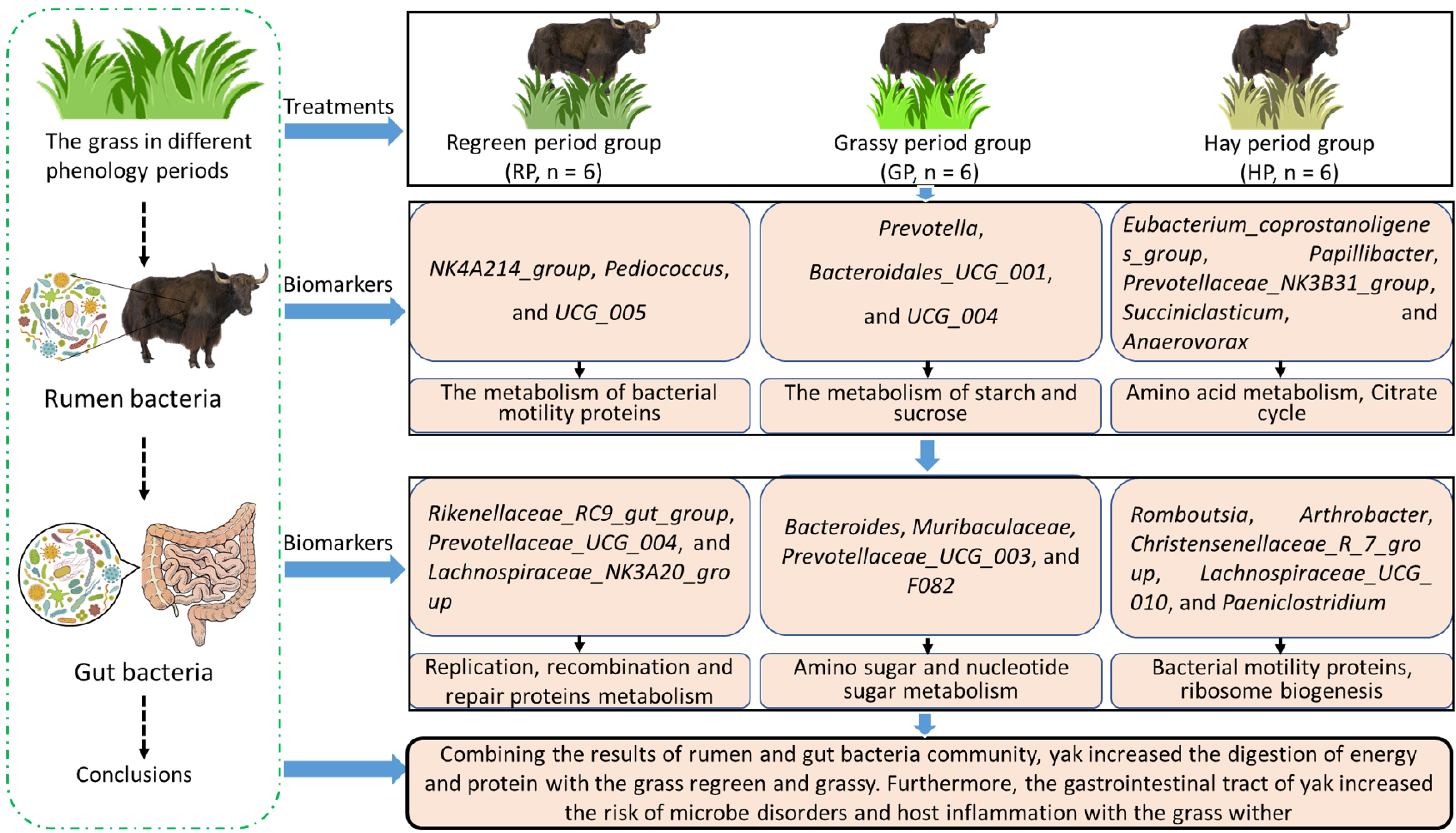 中國(guó)科學(xué)院西北高原生物研究所高寒生態(tài)監(jiān)測(cè)與可持續(xù)發(fā)展研究團(tuán)隊(duì)以放牧牦牛為研究對(duì)象,以牧草營(yíng)養(yǎng)組成、腸道微生物和牦牛肉品質(zhì)為切入點(diǎn),采用16S rRNA測(cè)序和代謝組學(xué)等研究方法。探究了不同物候期牧草組成對(duì)牦牛胃腸道微生物及肉品質(zhì)的影響,闡明了“物候期牧草-瘤胃微生物-牦牛肉品質(zhì)”之間的關(guān)系及其調(diào)控機(jī)制。結(jié)果表明,不同物候期的牧草營(yíng)養(yǎng)組成改變了放牧牦牛瘤胃微生物群落,同時(shí),微生物的季節(jié)性變化參與了牦牛肉品質(zhì)的調(diào)控。