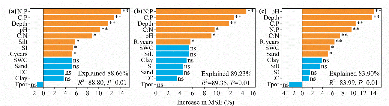 圖2?土壤理化指標在解釋有機碳儲量(a)、總氮儲量(b)和總磷儲量(c)變化中的重要性