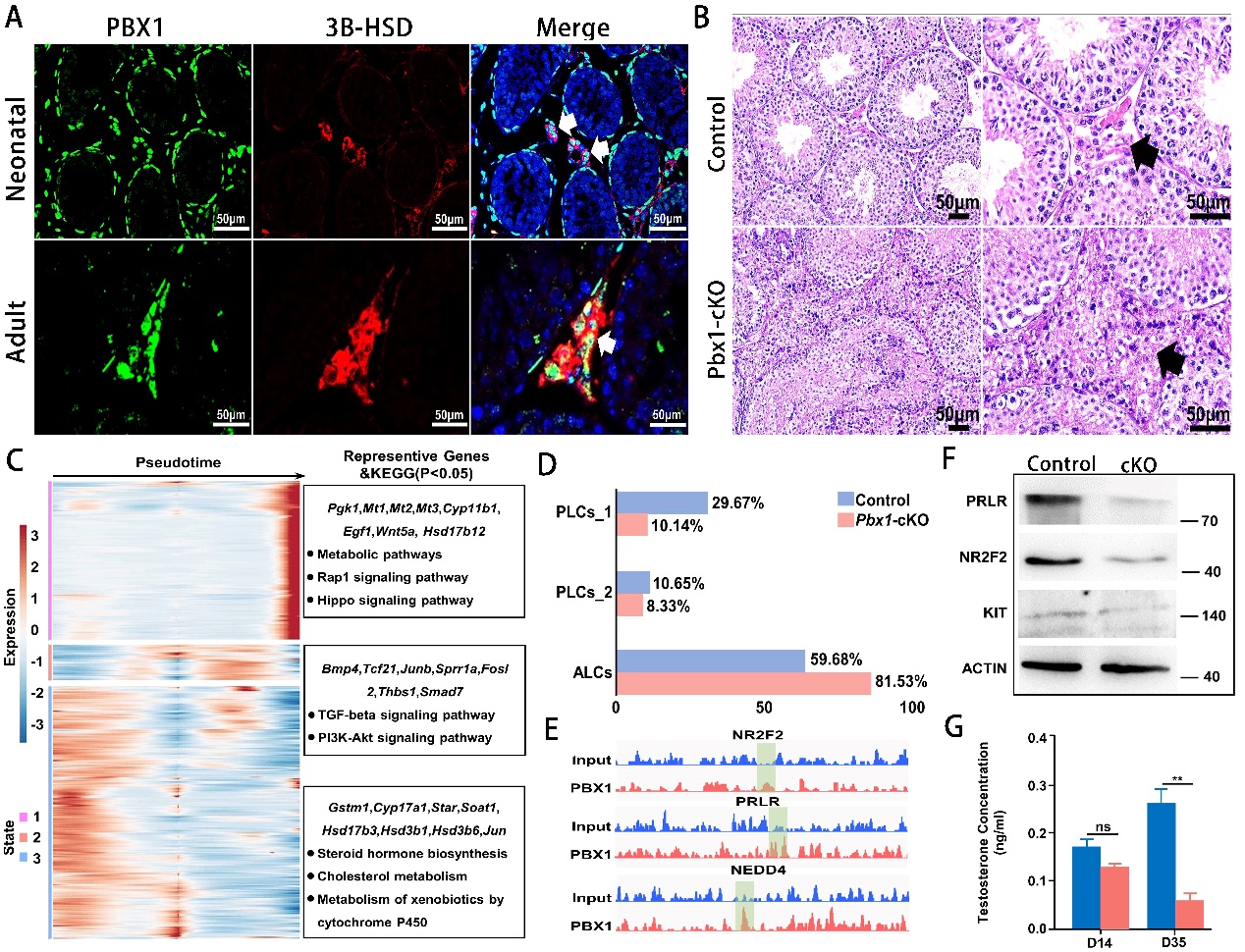 論文代表圖:A:轉(zhuǎn)錄因子PBX1在小鼠間質(zhì)細胞表達;B:間質(zhì)細胞特異性敲除Pbx1導致曲精小管結(jié)構(gòu)完整性受損;C:Pbx1敲除導致間質(zhì)細胞基因表達異常;D: Pbx1敲除導致不同類型間質(zhì)細胞比例異常;E:ChIP-seq結(jié)果顯示PBX1和Nr2f、Prlp、Nedd4等類固醇合成關(guān)鍵基因的啟動子區(qū)結(jié)合;F:Nr2f、Prlp、Kit蛋白在Pbx1敲除間質(zhì)細胞的表達水平低于對照;G:Pbx1敲除小鼠睪酮水平顯著降低。