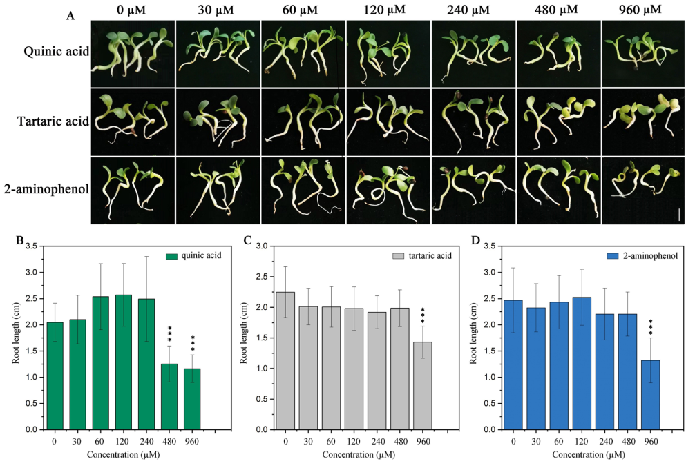 圖2:不同濃度2-氨基苯酚、奎尼酸或酒石酸處理10日齡蒙古黃芪幼苗的形態(tài)和根長。