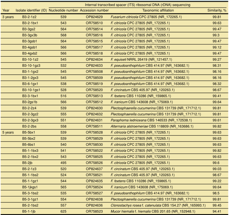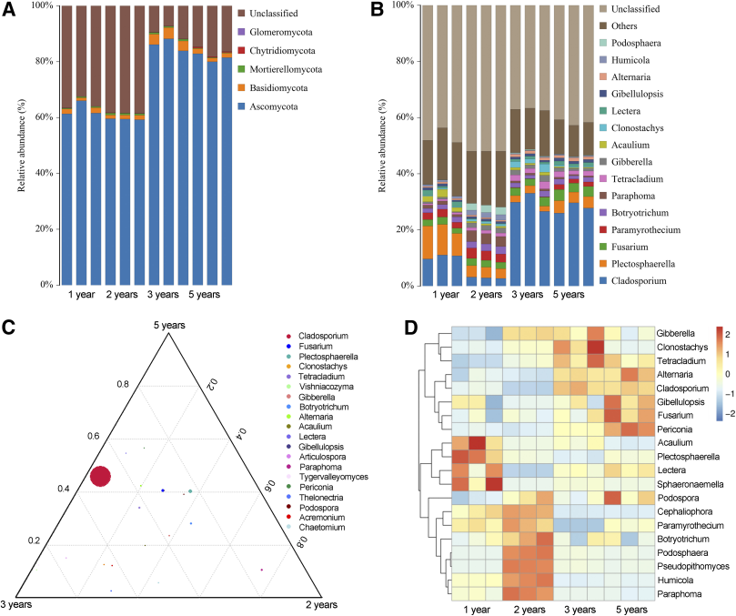 研究表明,黨參大田連作3年后,萎蔫和多種根腐病害頻發(fā);連作3年和5年土壤速效鉀含量和pH值顯著降低;與連作1年和2年相比,連作3年和5年的黨參根際土壤中真菌群落多樣性更高,并且一些屬水平的潛在致病性真菌分類群的豐度明顯增加;在連作3年和5年的黨參根際,共分離到Fusarium species complexes等菌33株;且屬水平真菌群落豐度與速效磷、全氮和土壤有機質呈顯著正相關。