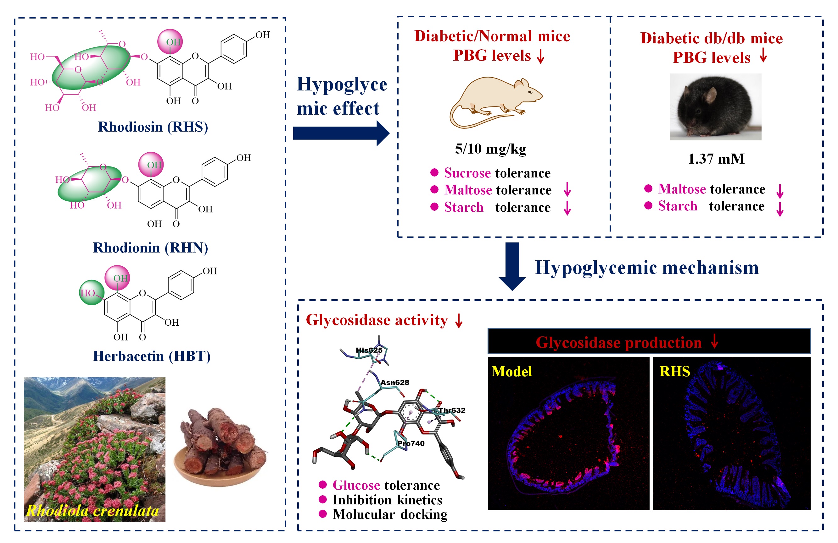 本研究首次系統(tǒng)地闡明了紅景天8-羥基黃酮類化合物降低PBG作用,揭示了其構(gòu)效關(guān)系和降血糖機(jī)制。研究表明,黃酮類化合物中8位羥基的取代可以顯著增強(qiáng)其降血糖作用,與市售藥物阿卡波糖相當(dāng),具有治療藥物或者保健品開發(fā)的潛質(zhì)。