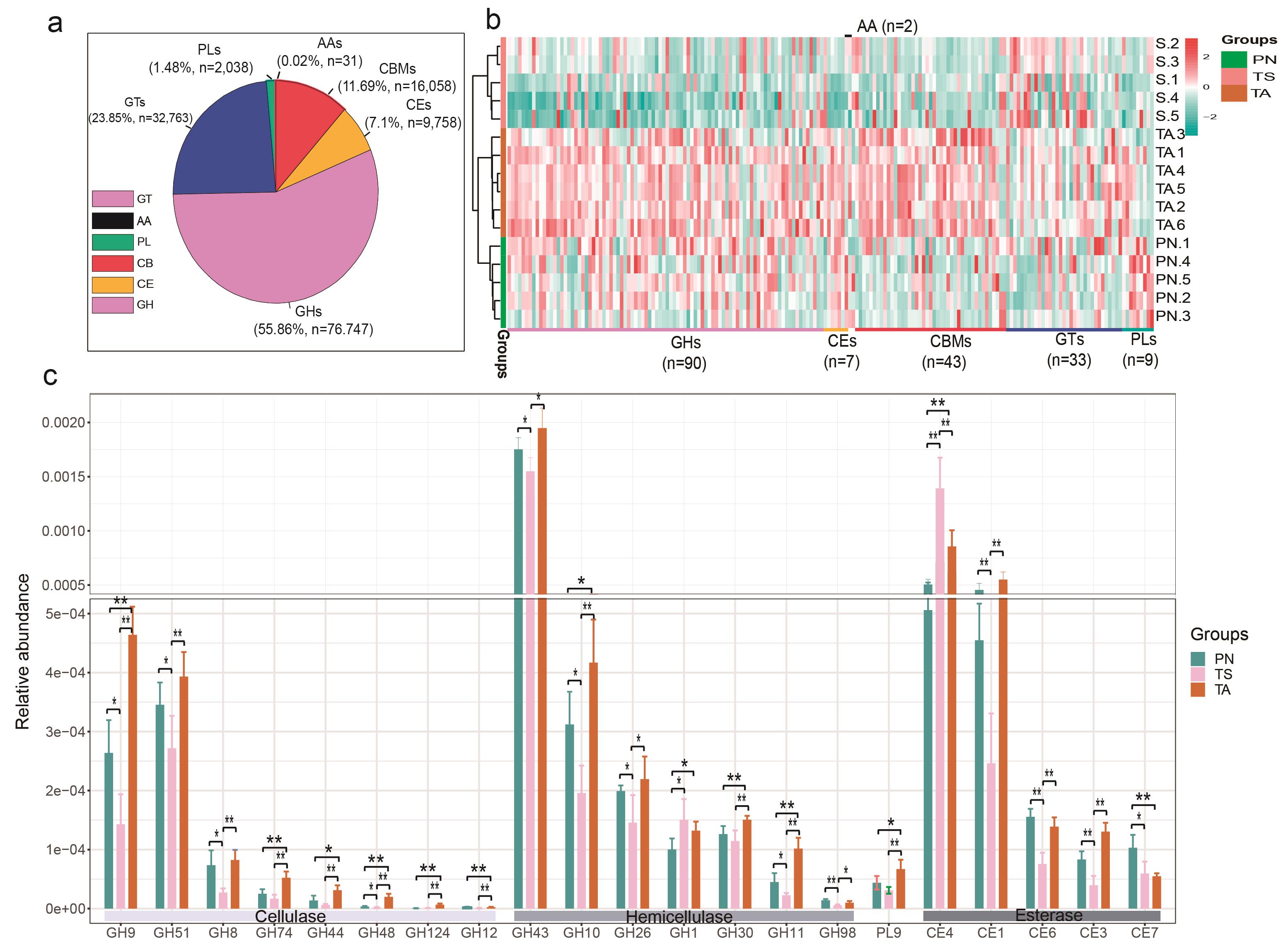 不同小反芻動物CAZYme酶基因分布特征。(a) unigenens 整體分布狀況;(b)糖苷水解酶(GHs)、糖基轉移酶(GTs)、多糖裂解酶(PLs)、碳水化合物酯酶(CEs)及碳水化合物結合模塊(CBMs)富集分析;(c)不同小反芻動物腸道菌群有關纖維素酶、半纖維素酶及酯酶基因顯著性分析