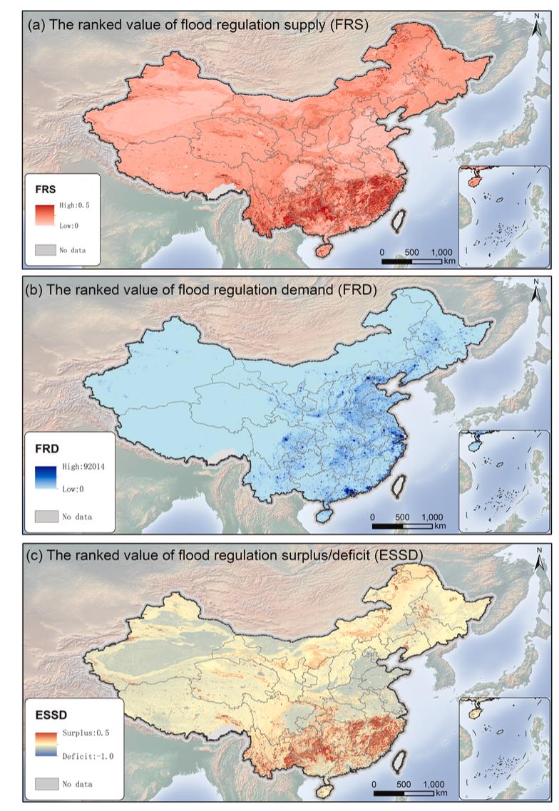 FRESF工具箱2號模塊的示例輸出,空間明確地繪制了我國2020年洪水調(diào)蓄生態(tài)系統(tǒng)服務(wù)的供給?。╝)、需求 (b) 和赤字?。╟)