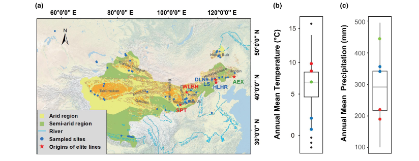 圖4??沙蓬采樣點(diǎn)的地理分布和當(dāng)?shù)貧夂驐l件以及選育株系的起源地