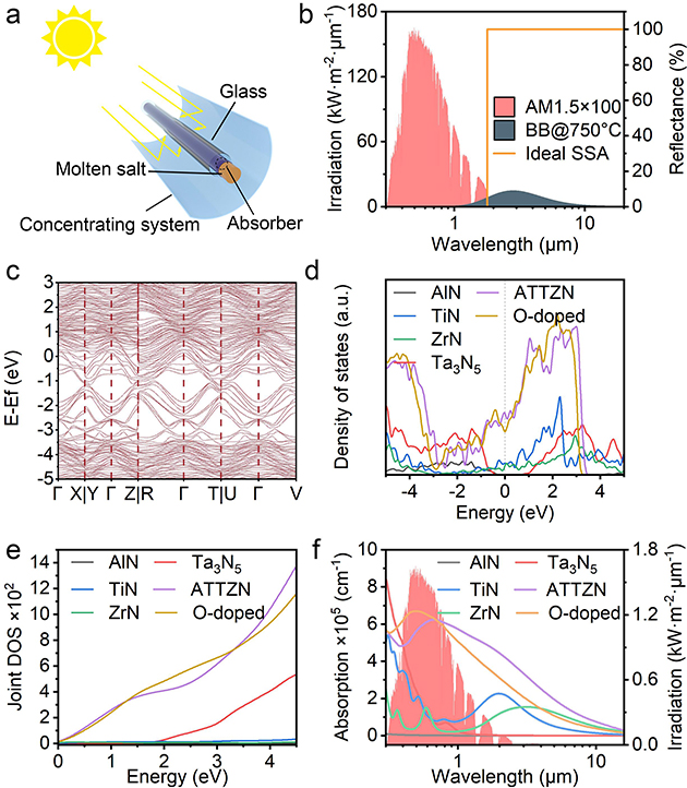 基于高熵氮化物光吸收材料的前期研究,為滿足聚光太陽能系統(tǒng)高溫(750°C)工況下的應(yīng)用需求,研究人員精心選擇了構(gòu)成元素,并系統(tǒng)性地研究了高熵設(shè)計(jì)對材料電子結(jié)構(gòu)的影響(圖1)。研究結(jié)果顯示,高熵氮化物的復(fù)雜能帶結(jié)構(gòu)顯著提高了費(fèi)米能級附近的態(tài)密度。同時(shí),平坦的能帶結(jié)構(gòu)拓寬了材料的太陽能吸收范圍,并增強(qiáng)了帶間躍遷效應(yīng),提升了材料的太陽能吸收性能。