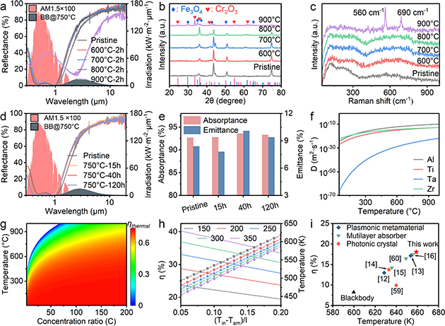 該團(tuán)隊(duì)通過反應(yīng)磁控濺射法制備出由高熵氮化物吸收層和氮化硅減反射層組成的雙層光譜選擇性吸收涂層。在太陽光譜波段(0.3-2.5 μm)表現(xiàn)出92.7%的吸收率,紅外波段的熱發(fā)射率僅為8.4%。在1 kW·m-2模擬太陽光輻照條件下,涂層表面溫度在10分鐘內(nèi)可達(dá)到83.3°C;在戶外應(yīng)用中,其平衡溫度與非選擇性涂層的差異高達(dá)~21°C,展現(xiàn)出優(yōu)異的光熱轉(zhuǎn)換效率和光譜選擇性。此外,得益于高熵效應(yīng)和緩慢擴(kuò)散效應(yīng)帶來的結(jié)構(gòu)穩(wěn)定性,該涂層在750°C退火后仍保持了出色的光學(xué)性能(圖2)。該涂層憑借其出色的光熱轉(zhuǎn)換能力、優(yōu)異的熱穩(wěn)定性和簡單易于規(guī)模化生產(chǎn)的雙層結(jié)構(gòu),在提升槽式聚光發(fā)電系統(tǒng)效率方面具有重要意義,并為能源新質(zhì)生產(chǎn)力發(fā)展提供了技術(shù)支撐。相關(guān)研究成果發(fā)表在Advanced Functional Materials (2024,2411316)上。趙鵬博士為論文的第一作者,高祥虎研究員和何成玉博士后為共同通訊作者。