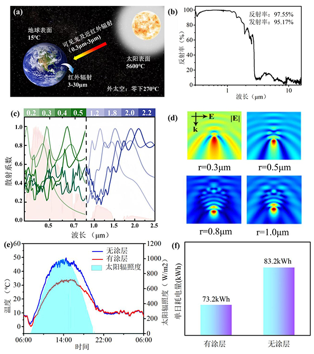 圖2.?。?/span>a) 構建地球-太陽-外太空能源利用體系;(b) 輻射制冷涂層反射光譜;(c) 不同粒徑光學材料對0.5μm入射光的散射系數和(d) 電場分布;(e) 2024年8月18日06:00-19日06:00,太陽輻照度及儲能集裝箱表面溫度變化和(f) 空調制冷耗電量變化