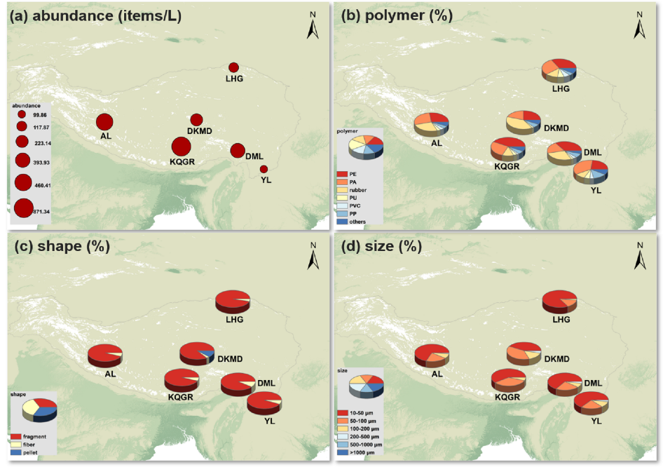 圖1 青藏高原典型冰川雪坑中微塑料的特征。其中:(a) 微塑料豐度,(b) 微塑料聚合物成分,(c) 微塑料形狀,(d) 微塑料尺寸分布。(YL-白水河1號(hào)冰川、DML-德姆拉冰川、KQGR-闊瓊崗日冰川、AL-昂龍冰川、DKMD-冬克瑪?shù)妆?、LHG-老虎溝12號(hào)冰川)。(Wang Z et al.,2024)