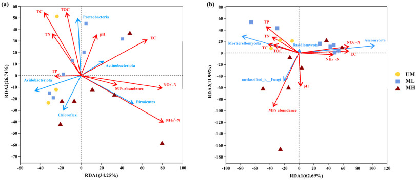 高通量測(cè)序分析表明,塑料圈中的α多樣性(Chao1和香農(nóng)指數(shù))低于土壤中的α多樣性,且隨土壤中微塑料豐度的變化而顯著不同。隨著微塑料豐度的增加,土壤中有機(jī)質(zhì)降解類群和光自養(yǎng)類群的比例也隨之增加,并顯示在塑料圈中富集。功能預(yù)測(cè)進(jìn)一步表明,微塑料的豐度影響了土壤的潛在功能,如與碳和氮循環(huán)相關(guān)的代謝途徑。與土壤環(huán)境相比,塑料圈中與有機(jī)物降解相關(guān)的功能豐度較高,且塑料圈的潛在健康風(fēng)險(xiǎn)更高。根據(jù)冗余(RDA)分析,可以確定環(huán)境理化性質(zhì)和微塑料豐度對(duì)真菌群落的影響大于對(duì)細(xì)菌群落的影響(圖3)。這表明,微塑料豐度會(huì)影響微生物多樣性組成,并可能影響土壤生態(tài)系統(tǒng)的整體性能。