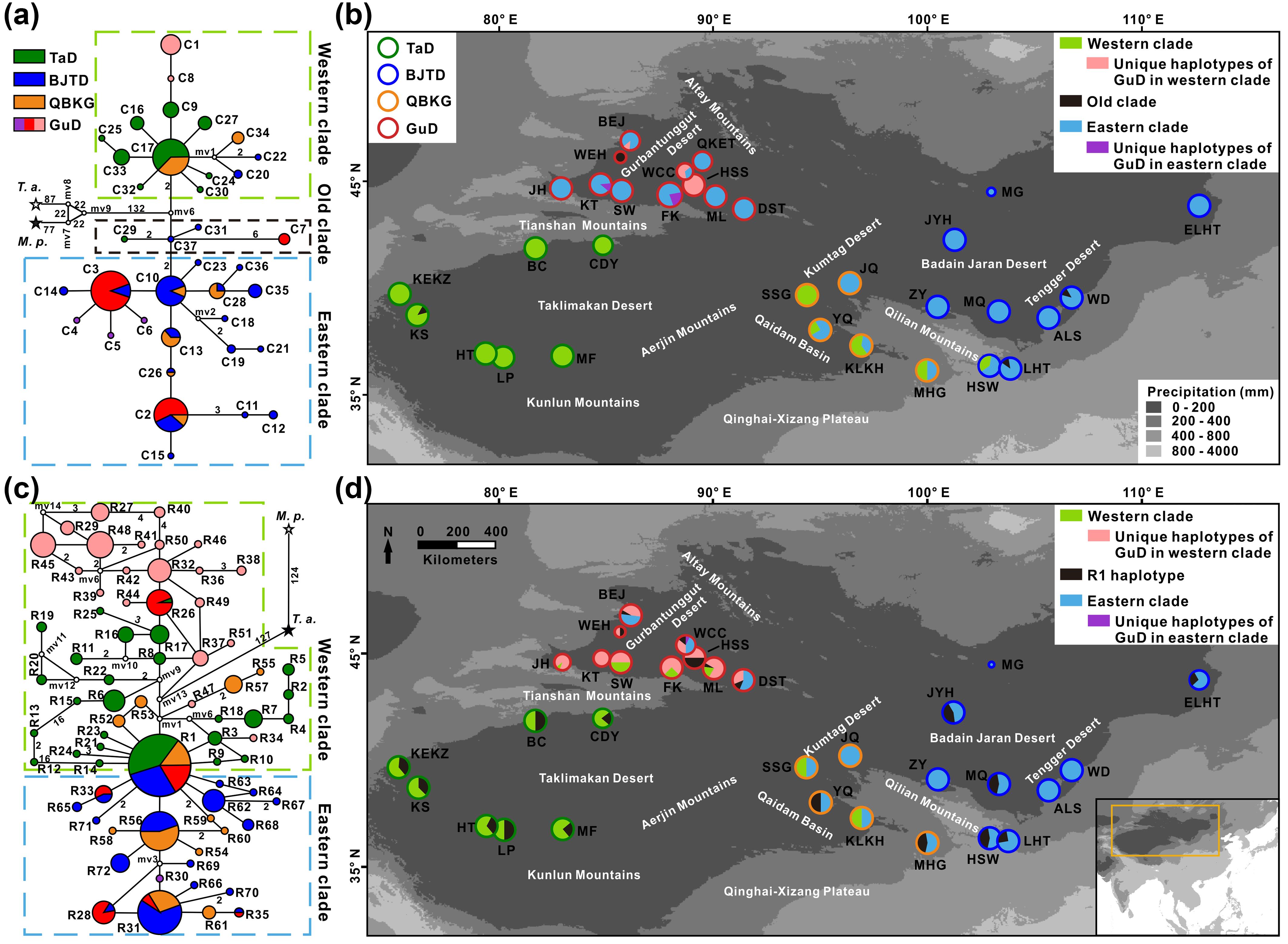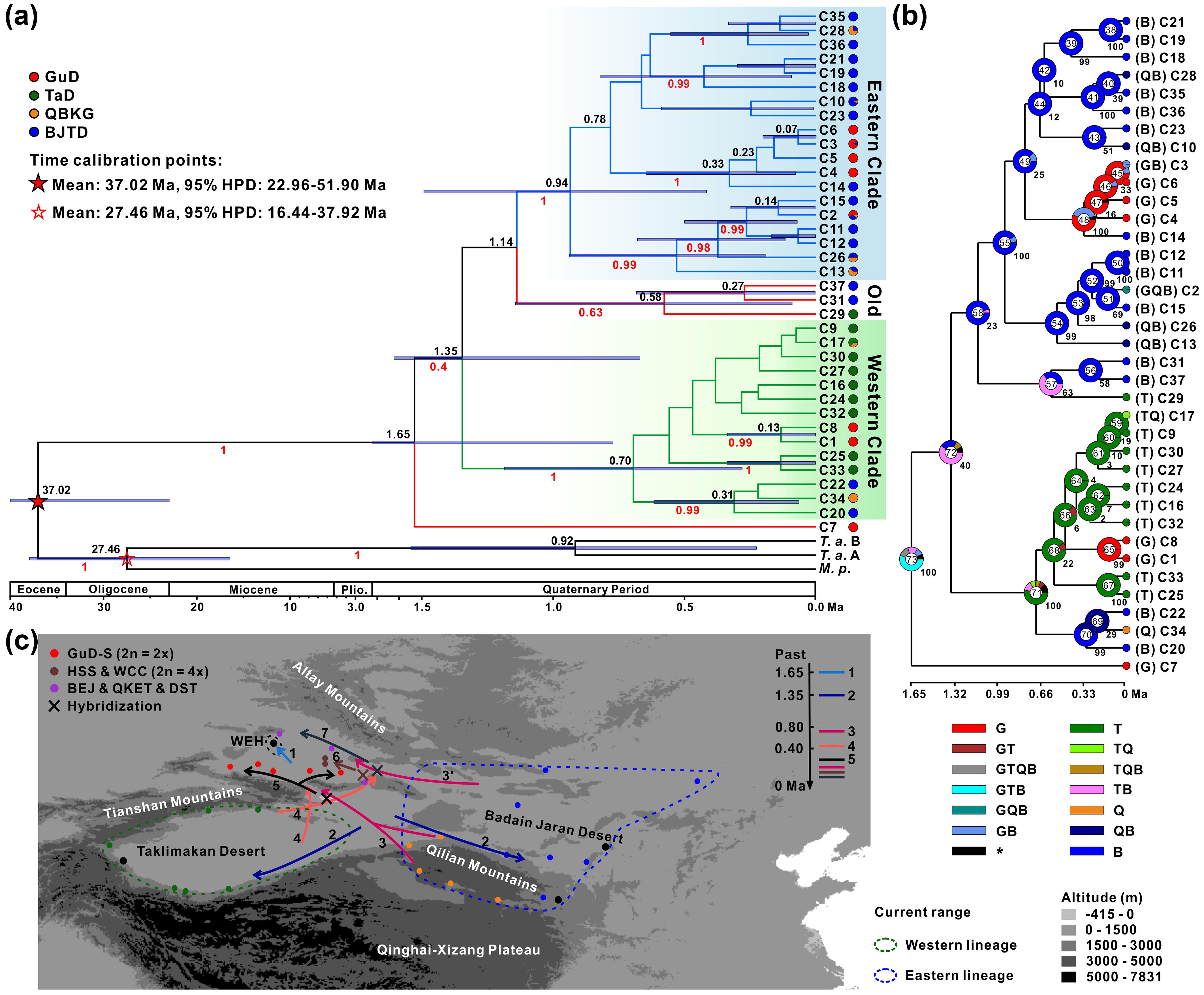 除烏爾禾群體以外,GuD-S和GuD-N的起源時間均晚于0.5百萬年前,推測第四紀氣候震蕩和昆侖-黃河運動導(dǎo)致的古爾班通古特沙漠多次收縮和擴張,為親本支系之間或雜交后代與親本支系之間的二次接觸提供了機會,是北疆紅砂種內(nèi)多樣性發(fā)生的主要原因,這為認識準噶爾盆地植物區(qū)系的復(fù)雜起源以及雜交在物種多樣性中的作用提供了一個范例。