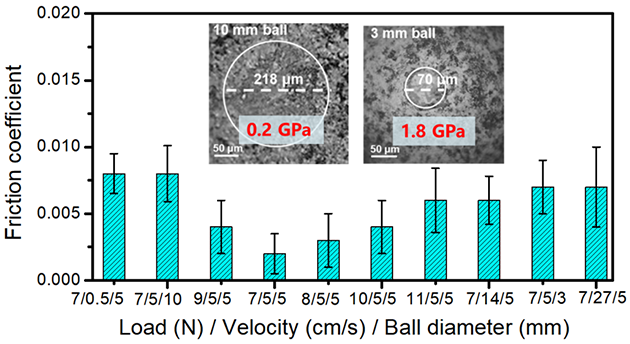 同時,研究人員發(fā)現(xiàn)碳薄膜表面石墨烯片段之間彼此排列角度各異、呈現(xiàn)出無序性。這種結(jié)構(gòu)無序性誘導(dǎo)與石墨表面之間非公度性,加之薄膜整體成型制備避免了石墨烯邊緣暴露,有效減弱了阻礙結(jié)構(gòu)超潤滑放大的邊緣效應(yīng),從而通過石墨島尺度逐級增加,實(shí)現(xiàn)了濕度不敏感超潤滑跨尺度放大。本研究也存在不足,近似無磨損的設(shè)計,限制了體系承載性等性能的提高。