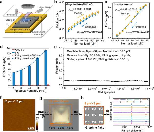近日,研究人員針對固體表面濕度敏感、超潤滑跨尺度易失效等基礎(chǔ)科學(xué)問題開展系統(tǒng)研究。基于文獻(xiàn)調(diào)研,發(fā)現(xiàn)固體表面濕度敏感源于磨損后暴露的新表面,導(dǎo)致與水分子作用強(qiáng)烈的化學(xué)斷鍵形成。研究人員提出了運(yùn)動界面“(近似)無磨損無化學(xué)反應(yīng)”思路,通過磁控濺射物理氣相沉積技術(shù),制備石墨烯覆蓋表面的納米結(jié)構(gòu)碳薄膜,構(gòu)建碳薄膜/微觀石墨島體系,實(shí)現(xiàn)了穩(wěn)健、濕度不敏感超潤滑(即相對濕度2-80%下均實(shí)現(xiàn)超滑)。鑒于界面近似無磨損特性,該體系表現(xiàn)出結(jié)構(gòu)性超潤滑性質(zhì)。