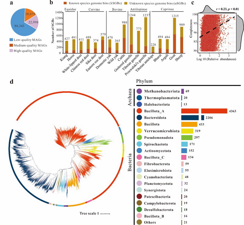 中國科學(xué)院西北高原生物研究所動(dòng)物生態(tài)與資源保護(hù)研究團(tuán)隊(duì)以中國境內(nèi)奇蹄目(Perissodactyla)和鯨偶蹄目(Cetartiodactyla)17個(gè)常見有蹄類物種為研究對象,通過大規(guī)模宏基因組測序和組裝、分箱和注釋,獲得131,416個(gè)宏基因組組裝基因組(MAGs),其中包含22,998個(gè)高質(zhì)量MAGs和11,175個(gè)菌種水平基因組(SGBs),成功構(gòu)建了中國典型有蹄類物種的腸道微生物宏基因組圖譜,其中60%左右的SGBs為本研究首次報(bào)道。