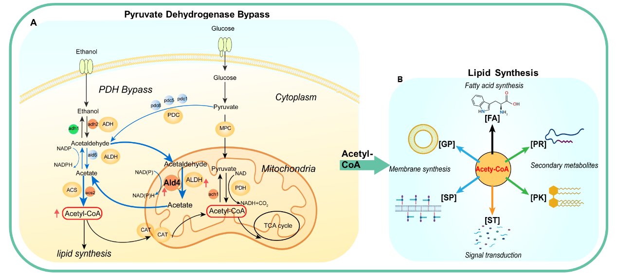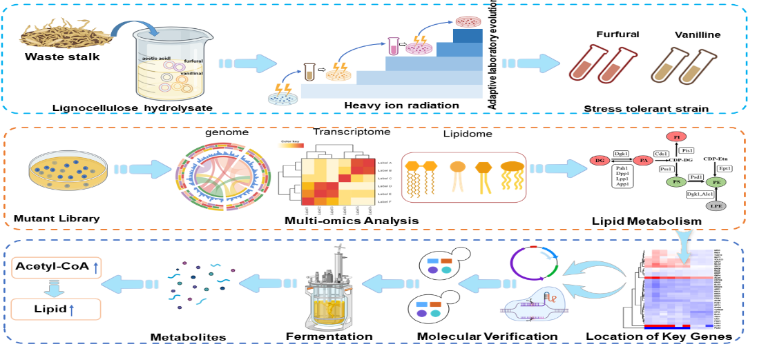 基于此現(xiàn)狀,科研人員利用蘭州重離子加速器(HIRFL)對目標(biāo)突變體實施多輪輻射,結(jié)合ALE技術(shù)提高了酵母的抗逆性和耐受性,因此獲得了適應(yīng)性更強的底盤細(xì)胞。再通過多組學(xué)聯(lián)合分析方法識別出與其發(fā)酵性能相關(guān)的重要基因,利用基因編輯技術(shù)對代謝通路進(jìn)行精準(zhǔn)優(yōu)化,著重優(yōu)化了核心代謝中間產(chǎn)物的代謝通量,使乙酰輔酶A水平較之前提高了17.10%,從而顯著提高了酵母在合成脂類和其他高附加值化合物方面的產(chǎn)量。