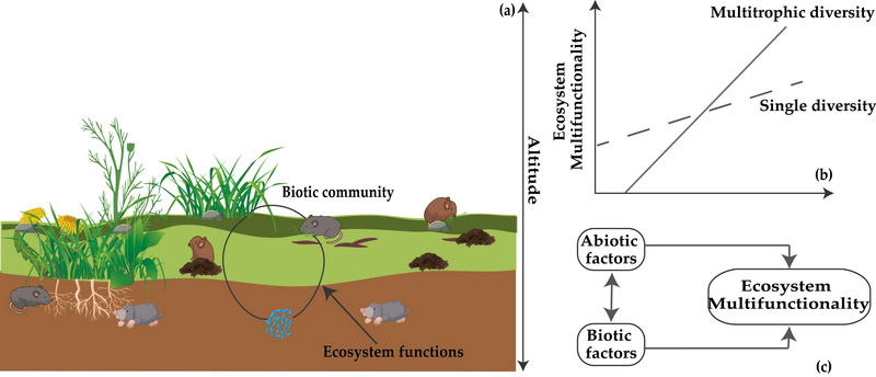 概念框架:(a) 生物群落由三個營養(yǎng)級組成—植物、嚙齒動物和微生物;(b) 多營養(yǎng)級多樣性能夠增強生態(tài)系統(tǒng)多功能性;(c) 生物因子和非生物因子對生態(tài)系統(tǒng)多功能性具有直接和間接影響