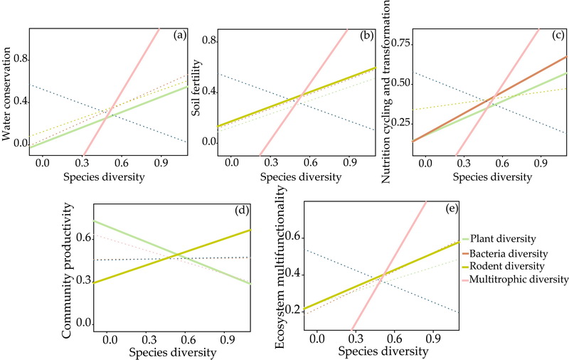 不同營養(yǎng)級物種多樣性對生態(tài)系統(tǒng)功能的影響:(a) 水分保持;(b) 土壤肥力;(c) 養(yǎng)分循環(huán)與轉(zhuǎn)化;(d) 群落生產(chǎn)力;(e) 生態(tài)系統(tǒng)多功能性。實線表示顯著關系,虛線表示無顯著關系