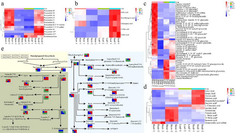 不同組織部分原花青素(a)、酚酸(b)、蒽醌(c)和有機酸(d)相對含量的熱圖及不同組織中黃酮醇生物合成途徑的一些關(guān)鍵代謝物的變化(e)