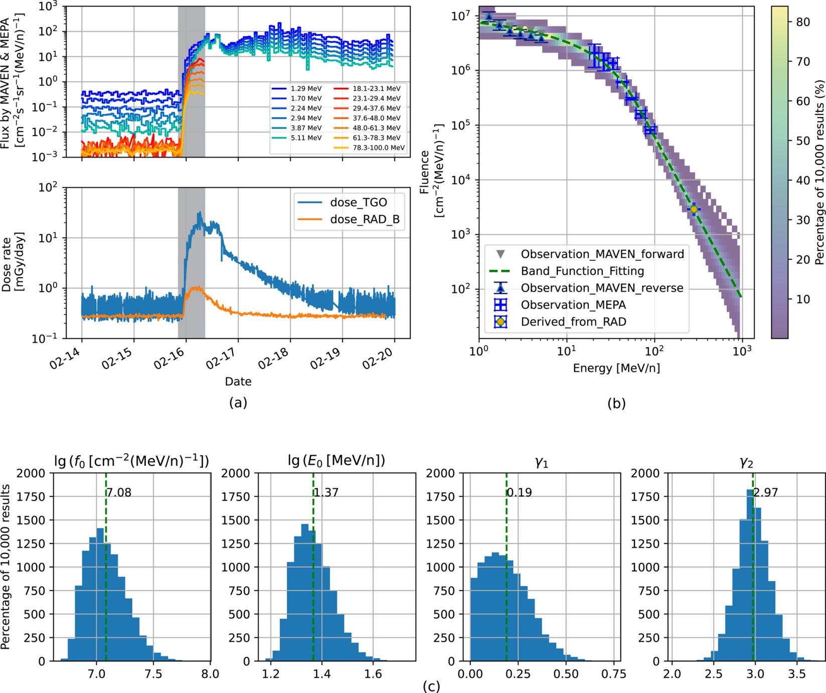 本研究使用了多個探測器數據來構建相關質子能譜。中低能段的質子能譜由能量粒子分析儀和美國高能粒子儀提供。更高能段的質子通量是團隊結合火星表面的輻射評估探測器和火星粒子傳輸模型模擬反演得到。研究團隊通過對上述觀測和反演的能譜進行擬合,得到了此次太陽高能粒子事件在火星空間1~1000MeV能量范圍內的完整質子能譜。