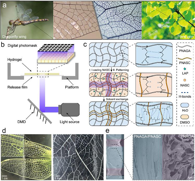 近日,中國科學(xué)院蘭州化學(xué)物理研究所潤滑材料重點實驗室受自然界中廣泛存在的圖案化異質(zhì)結(jié)構(gòu)(如昆蟲翅膀和植物葉脈等)啟發(fā),發(fā)展了一種圖案化水凝膠(CSN水凝膠)方案實現(xiàn)了其多屬性、寬范圍的力學(xué)性能調(diào)控。如圖1所示,研究人員以光固化聚(N-丙烯酰甘氨酰胺)(PNAGA)水凝膠作為軟基質(zhì),通過先浸泡N-丙烯?;被澹?/span>NASC)前驅(qū)體溶液再以選區(qū)曝光構(gòu)建圖案化硬骨架(PNAGA@PNASC),然后經(jīng)后續(xù)水平衡過程中的相轉(zhuǎn)化誘導(dǎo)氫鍵重構(gòu)實現(xiàn)軟基質(zhì)和硬骨架的無縫互鎖,發(fā)展了具有局部互穿網(wǎng)絡(luò)的圖案化硬骨架強(qiáng)化水凝膠。