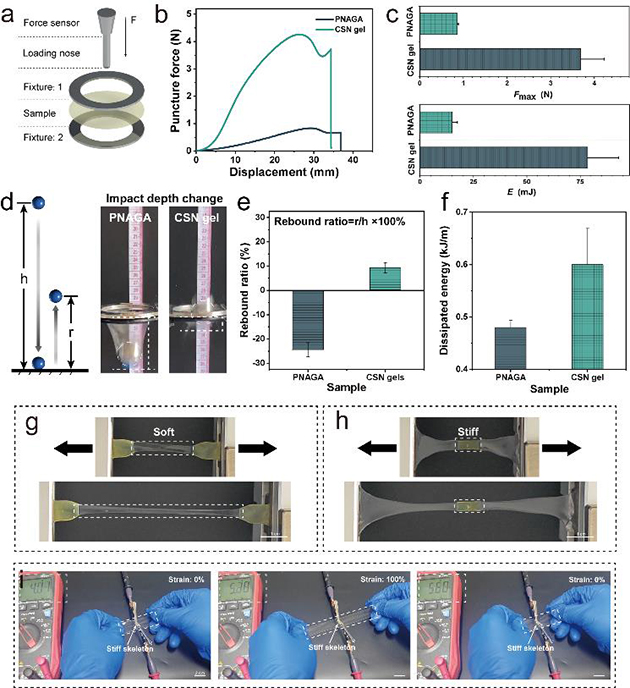 該方法制備的CSN水凝膠能夠在軟基質(zhì)凝膠基礎(chǔ)上,通過圖案化設(shè)計(包括圖案形狀、圖案參數(shù)、圖案化比例等)實現(xiàn)了其機(jī)械性能的增強(qiáng)和調(diào)控。研究人員通過對預(yù)制缺陷下的裂紋擴(kuò)展行為實驗、循環(huán)拉伸實驗、穿刺實驗和落球?qū)嶒瀸λ苽涞膱D案化CSN水凝膠的力學(xué)性能進(jìn)行了系統(tǒng)研究,結(jié)果表明,其韌性可在0.15-18 kJ m-2(120倍)、模量在0.32-5.92 MPa(19倍)內(nèi)進(jìn)行調(diào)控(圖2),并展現(xiàn)出優(yōu)異的預(yù)制缺陷擴(kuò)展和形變不敏感以及抗沖擊等特性(圖3),為適應(yīng)不同應(yīng)用需求及其應(yīng)用過程中的自適應(yīng)性提供了有效的解決方案。