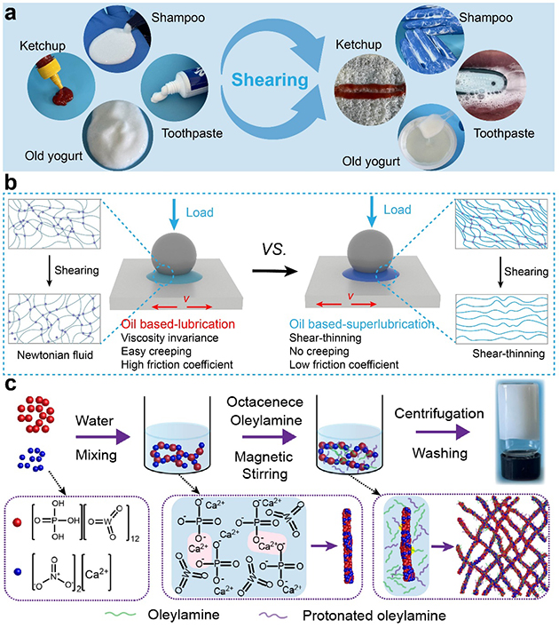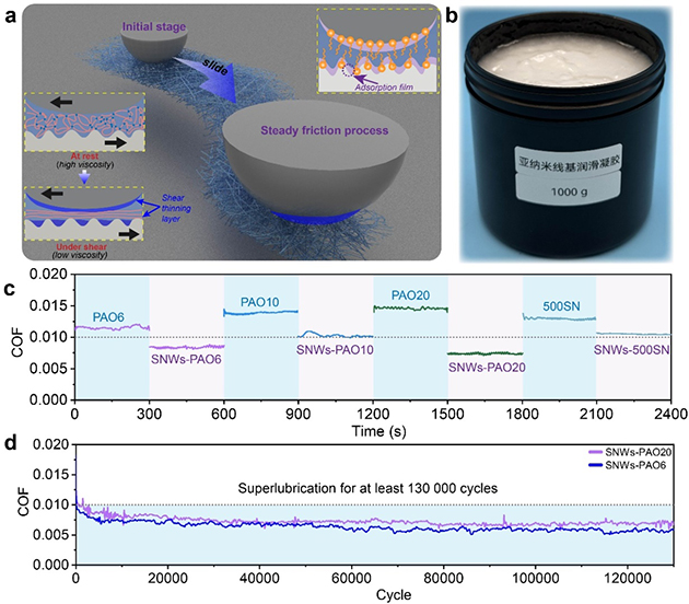 近期,中國科學(xué)院蘭州化學(xué)物理研究所潤滑材料重點(diǎn)實(shí)驗(yàn)室王道愛研究員團(tuán)隊(duì)基于剪切稀化效應(yīng)的新型亞納米線基油脂基潤滑劑(圖1),實(shí)現(xiàn)了在宏觀尺度下Si3N4與PTFE不同摩擦條件下的超潤滑,在12小時(shí)內(nèi)無需補(bǔ)充潤滑劑,摩擦系數(shù)穩(wěn)定保持在 0.007,展現(xiàn)出短磨合時(shí)間和長(zhǎng)期穩(wěn)定的潤滑性能,具備廣闊的工業(yè)應(yīng)用前景,為超潤滑領(lǐng)域帶來了新進(jìn)展。相關(guān)研究成果發(fā)表在Adv. Mater.(2024,2412257)上。