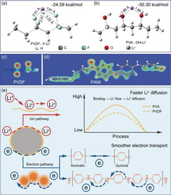 針對電化學(xué)吸附過程中電極內(nèi)Li+擴(kuò)散速率和電子轉(zhuǎn)移速率不匹配,從而制約電極電化學(xué)活性的問題,設(shè)計和制備了離子和電子雙導(dǎo)聚(乙烯醇)-聚苯胺(PVA-PANI)共聚物(CP),并包覆到吸附劑顆粒表面,促進(jìn)Li+擴(kuò)散和電子轉(zhuǎn)移,實現(xiàn)吸附效率的提高。HMO@CP電極具有優(yōu)越的電化學(xué)活性和吸附效率,吸附容量高達(dá)49.48 mg/g。機(jī)理研究表明,PVA中帶負(fù)電荷的羥基(-OH)可以富集Li+并加速Li+的擴(kuò)散,PANI中的共軛結(jié)構(gòu)和氧化還原活性醌類位點提供了更密集的電子分布促進(jìn)電子轉(zhuǎn)移(圖1)。該工作以離子擴(kuò)散和電子轉(zhuǎn)移為出發(fā)點,以提高離子擴(kuò)散速率和電子轉(zhuǎn)移速率匹配度為導(dǎo)向,實現(xiàn)吸附效率的提高(ACS Nano,18 (2024) 31204-31214)。