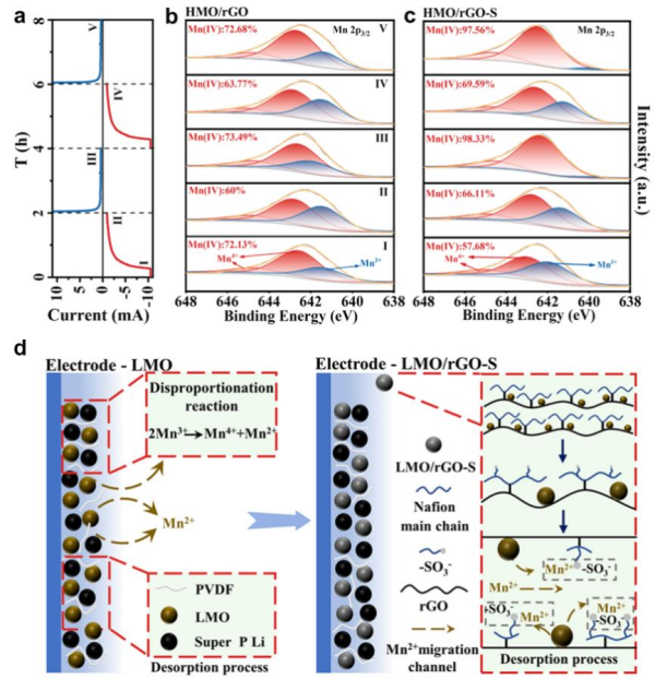 除離子傳輸效率外,針對錳基電活性材料因電極極化導(dǎo)致的穩(wěn)定性較差的問題,采用還原氧化石墨烯(rGO)與Nafion協(xié)同改性的策略制備得到高效穩(wěn)定電化學(xué)吸附材料。rGO在增加材料分散性的同時大幅降低了材料極化,緩解極化過程帶來的容量衰減,使得吸附容量和循環(huán)穩(wěn)定性得到提升。研究表明Nafion通過主鏈與還原氧化石墨烯表面羧基結(jié)合,而支鏈磺酸基團(tuán)(-SO3-)可以捕獲因歧化反應(yīng)溶出的Mn2+,從而使得材料表面局部Mn2+濃度升高(圖2)。經(jīng)過協(xié)同改性,材料30次循環(huán)容量保持率由79.04%提升至94.64%。該研究驗證了離子捕獲機(jī)制抑制歧化反應(yīng)的可行性,能夠為錳系材料在電化學(xué)分離過程中的溶損問題提供新的解決思路(Chem. Eng. J,497 (2024) 155009)。