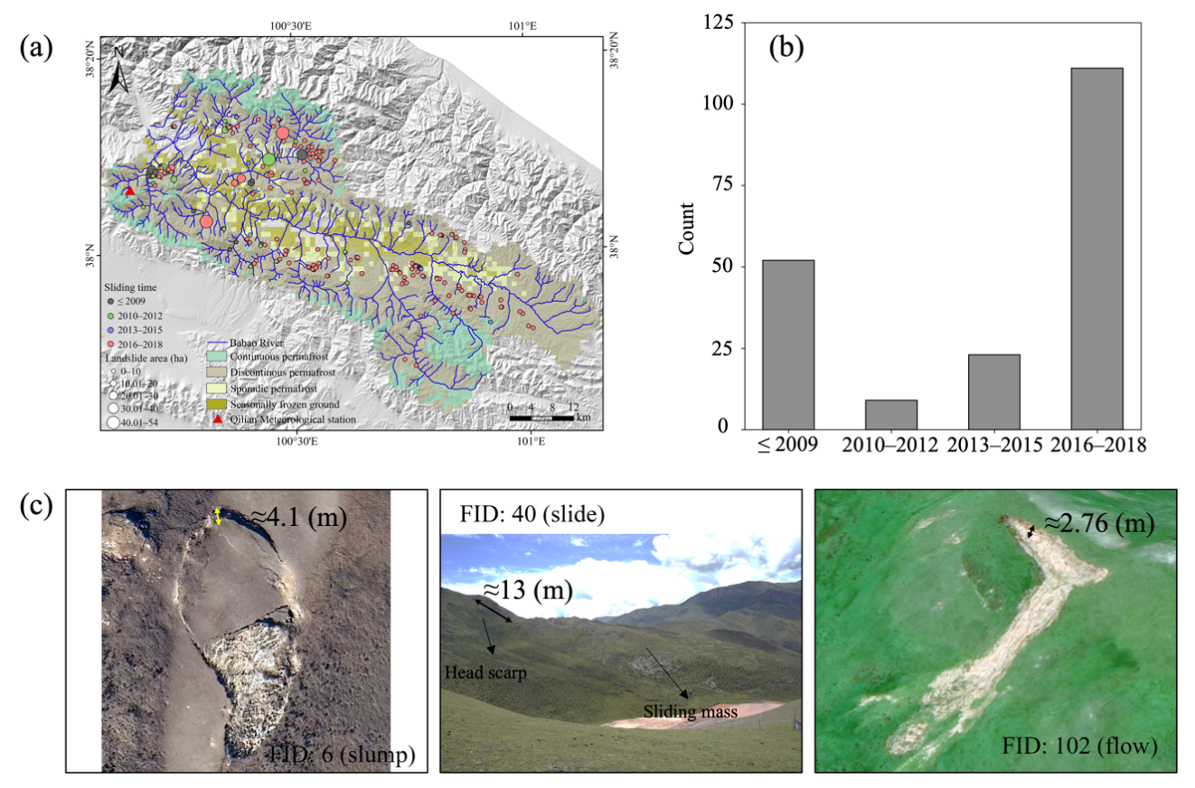 該成果以Elevation-dependent shift of landslide activity in mountain permafrost regions of the Qilian Mountains為題發(fā)表在Advances in Climate Change Research期刊,并獲國家重點研發(fā)計劃項目、國家自然科學基金項目和中國科學院“西部之光”基金項目等項目的資助。