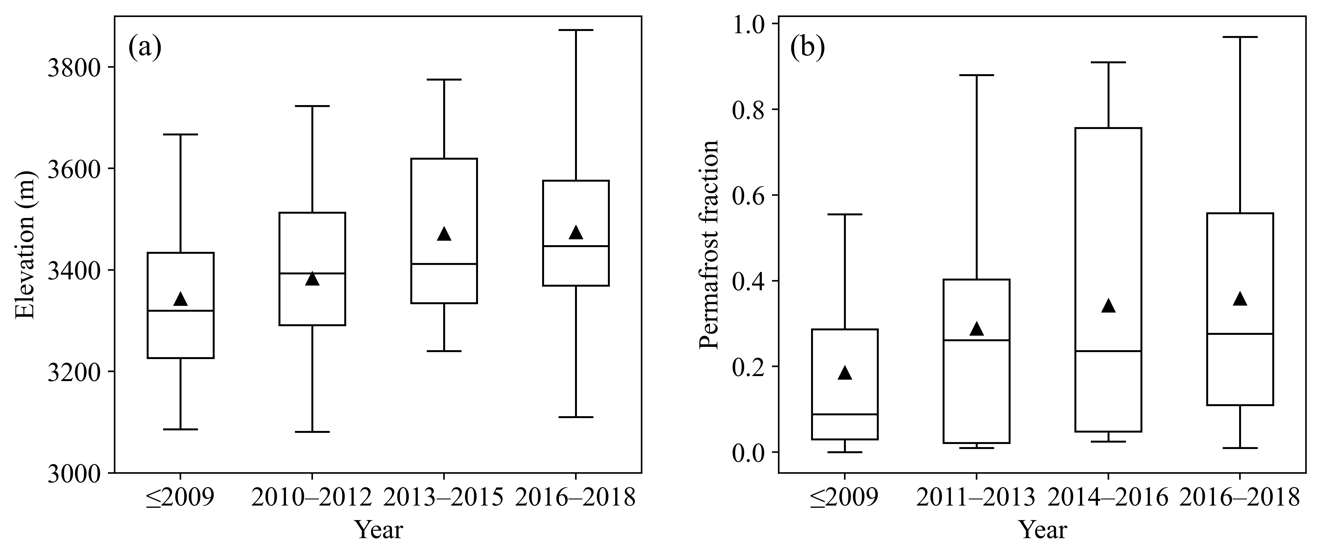 圖2:(a) 不同時期滑坡事件的海拔變化;(b) 滑坡事件對應的多年凍土變化趨勢