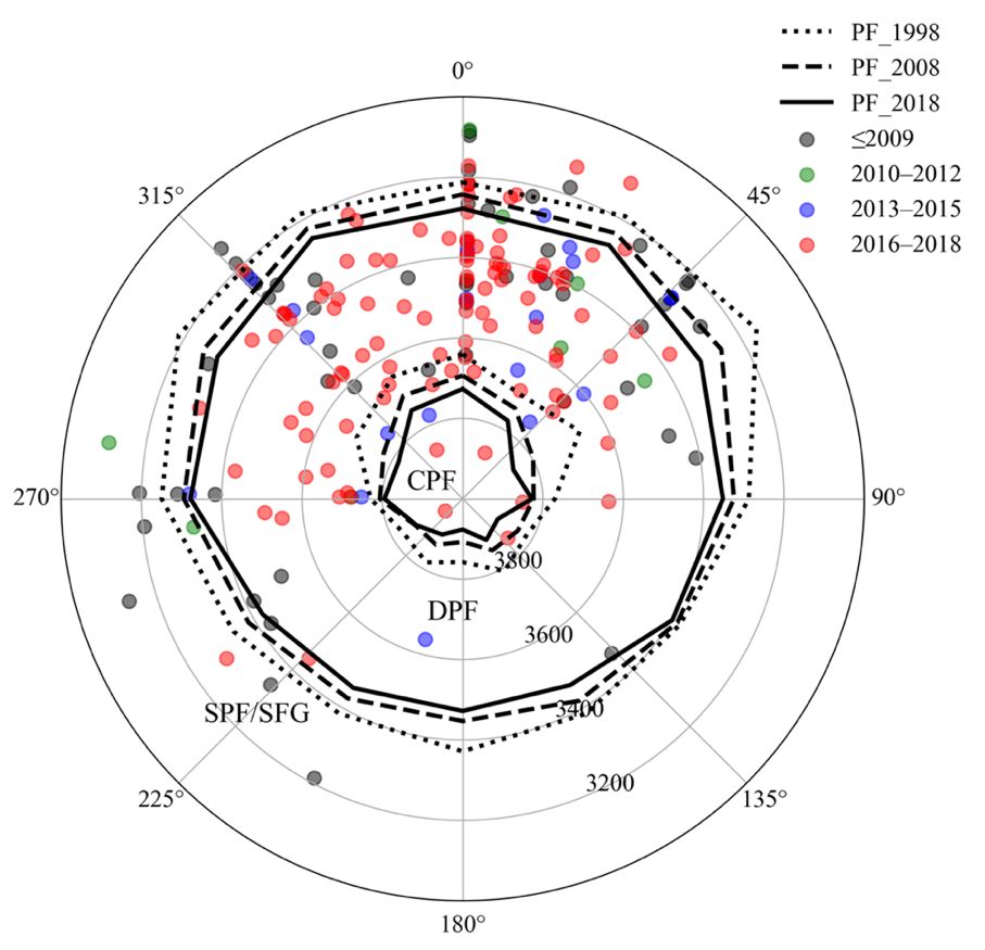 圖3:多年凍土邊界與滑坡的海拔、坡向和分布關系。三種不同線型分別代表1998年、2008年和2018年間稀疏多年凍土(SPF)、不連續(xù)多年凍土(DPF)和連續(xù)多年凍土(CPF)邊界的平均海拔。內圈的三條線為SPF到DPF的過渡區(qū),外圈的三條線為DPF到CPF的過渡區(qū)。不同顏色的小圓點表示滑坡在各時間段的海拔、坡向和數(shù)量分布特征