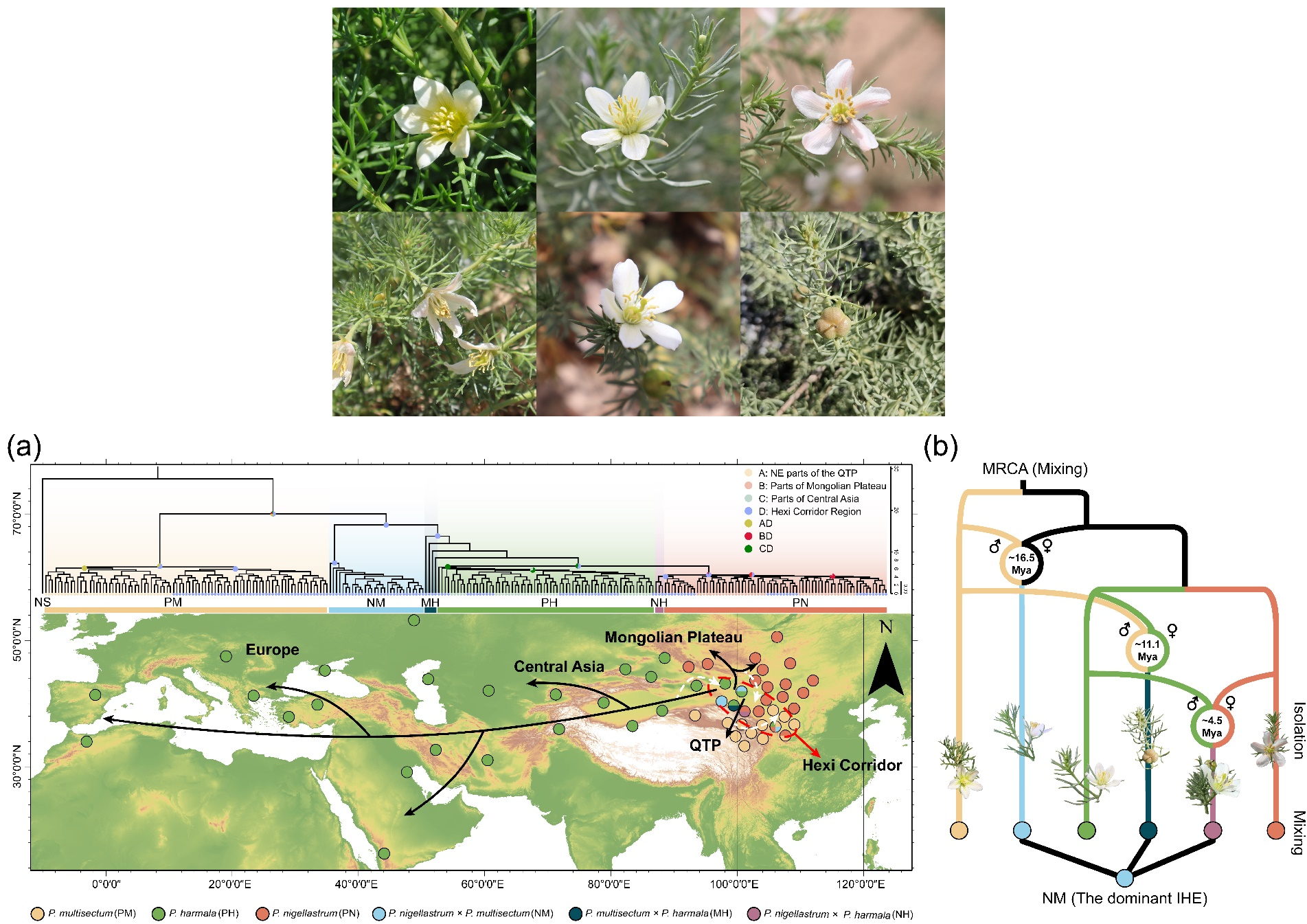 中國(guó)科學(xué)院西北高原生物研究所青藏高原植物適應(yīng)與進(jìn)化研究團(tuán)隊(duì)綜合利用Illumina二代測(cè)序、Oxford Nanopore三代測(cè)序及Hi-C互作圖譜技術(shù),成功構(gòu)建了多裂駱駝蓬的高質(zhì)量染色體水平參考基因組(2n=2x=24,基因組大小為314.37 Mb)?;谥衼喐珊祬^(qū)及其周邊地區(qū)的廣泛采樣,本研究對(duì)駱駝蓬屬及其中間形態(tài)類群的28個(gè)群體共284個(gè)個(gè)體進(jìn)行了全基因組重測(cè)序。研究結(jié)果表明,駱駝蓬屬起源于河西走廊地區(qū),通過(guò)擴(kuò)散作用和地理隔離形成了多裂駱駝蓬、駱駝?shì)锖婉橊勁畹漠愑蛭锓N形成。隨后,這些物種再次擴(kuò)散至河西走廊地區(qū),通過(guò)頻繁的基因交流演化出多種間斷雜交實(shí)體。本研究首次在中亞干旱區(qū)揭示了駱駝蓬屬的物種形成符合“混合-隔離-混合循環(huán)”(MIM cycles,Mixing-Isolation-Mixing cycles)的演化框架,解析了雜交物種形成的中間過(guò)渡階段。此外,研究發(fā)現(xiàn),間斷雜交實(shí)體通過(guò)基因交流繼承了親本的優(yōu)良性狀(如DNA損傷修復(fù)能力和抗旱適應(yīng)性),從而在自然選擇中表現(xiàn)出顯著的優(yōu)勢(shì)。通過(guò)對(duì)不同物種的轉(zhuǎn)錄組測(cè)序分析,進(jìn)一步驗(yàn)證了間斷雜交實(shí)體中與適應(yīng)性進(jìn)化相關(guān)的基因存在顯著差異表達(dá)。本研究通過(guò)對(duì)中亞干旱區(qū)駱駝蓬屬的系統(tǒng)性群體遺傳學(xué)研究,揭示了其獨(dú)特的物種形成模式,為雜交物種形成中間階段的研究提供了重要的模式類群,并為物種與雜交種間的適應(yīng)性進(jìn)化機(jī)制提供了新的理論依據(jù)。