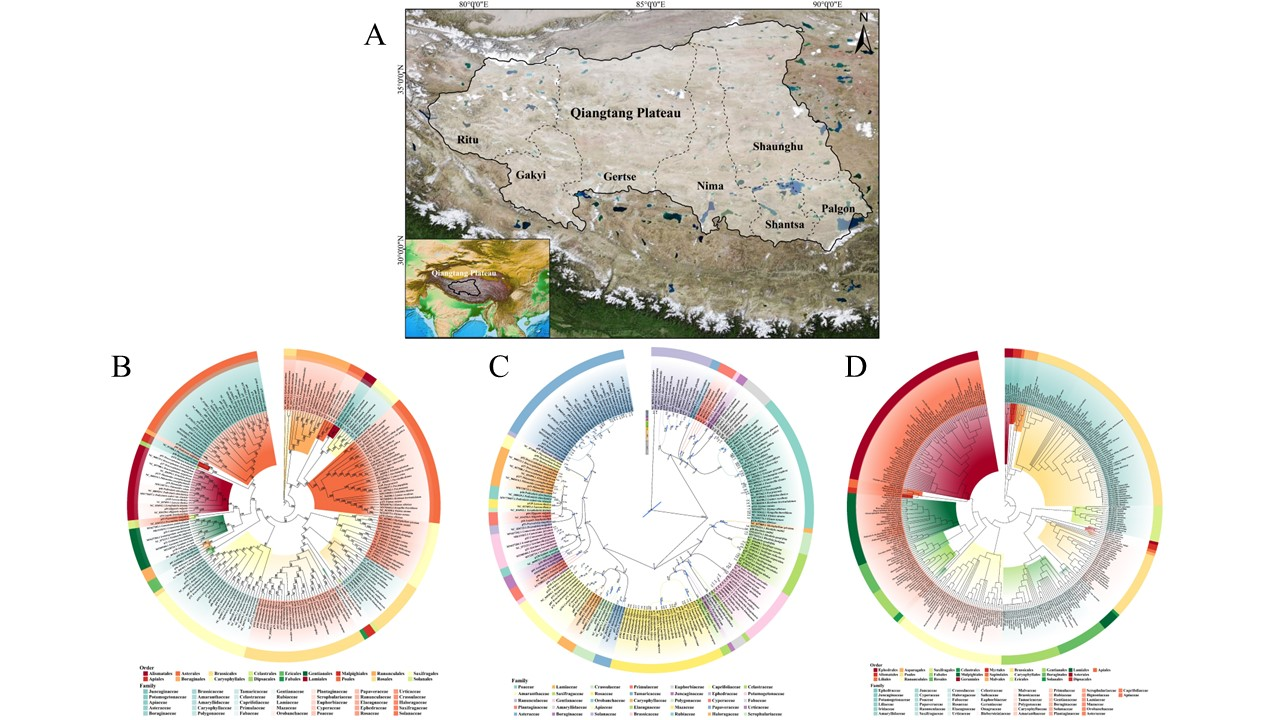 系統(tǒng)發(fā)育區(qū)系學(xué)通過將系統(tǒng)發(fā)育信息整合到植物區(qū)系分析中,推斷區(qū)系內(nèi)物種的分化時(shí)間,從而更好地反映不同區(qū)域物種分布及組合的動(dòng)態(tài)歷史過程,揭示區(qū)系的起源及演化歷史。羌塘高原位于青藏高原腹地,是“世界屋脊的屋脊”,因其獨(dú)特且完整的高寒生態(tài)系統(tǒng)以及眾多珍稀瀕危物種成為研究青藏高原乃至世界高寒干旱植物區(qū)系起源及演化歷史的天然實(shí)驗(yàn)室。本研究基于傳統(tǒng)植物區(qū)系學(xué)和系統(tǒng)發(fā)育區(qū)系學(xué)的方法,對羌塘高原種子植物開展區(qū)系研究,重建了370種植物的系統(tǒng)發(fā)育關(guān)系,對研究區(qū)內(nèi)各縣域網(wǎng)格單元進(jìn)行系統(tǒng)發(fā)育多樣性分析,并結(jié)合平均分化時(shí)間和物種分歧時(shí)間,探討羌塘高原植物多樣性格局及其形成機(jī)制。