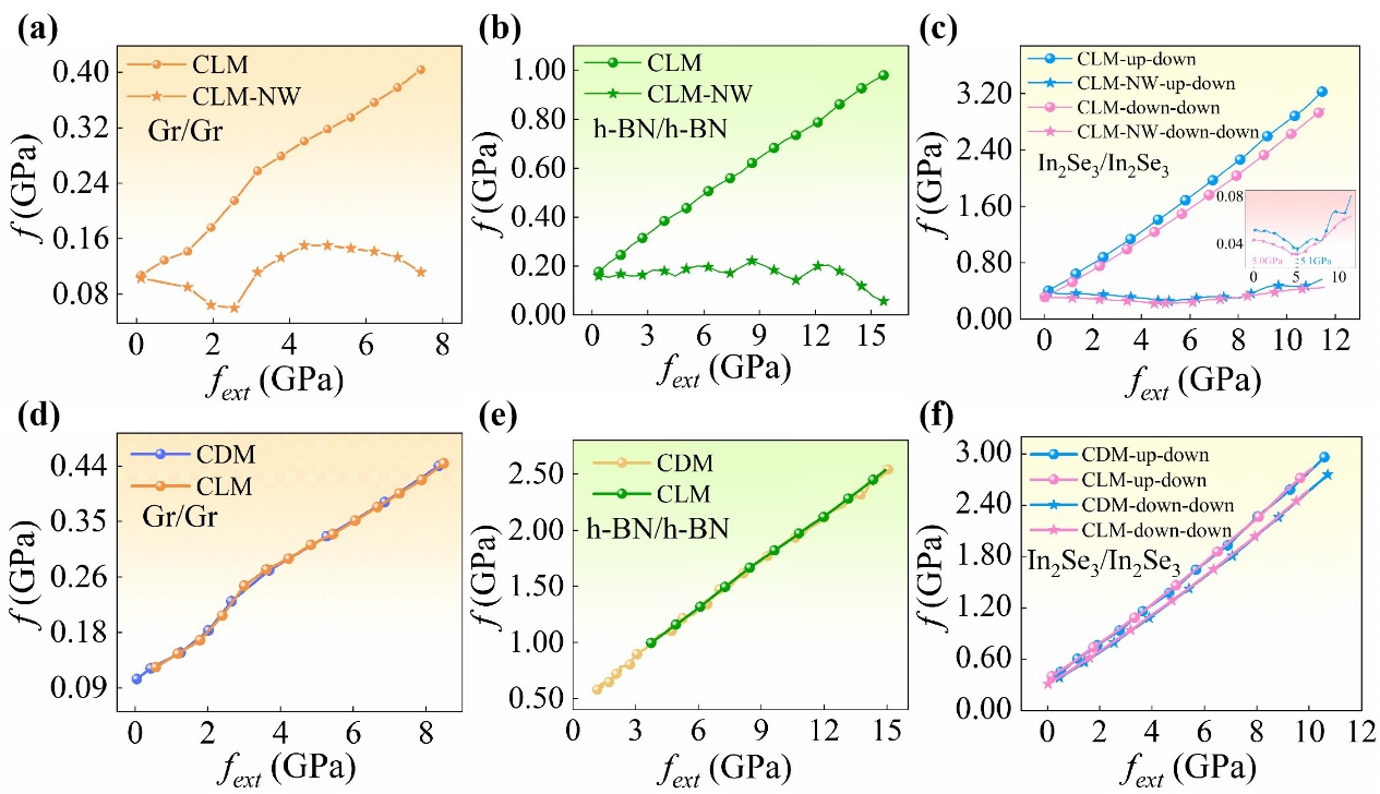 近日,中國(guó)科學(xué)院蘭州化學(xué)物理研究所潤(rùn)滑材料全國(guó)重點(diǎn)實(shí)驗(yàn)室計(jì)算摩擦學(xué)課題組與蘭州交通大學(xué)材料科學(xué)與工程學(xué)院等單位合作,使用自主搭建的固體界面摩擦性能第一性原理高通量計(jì)算平臺(tái)LICP-FPHTC-Platform ( 摩擦學(xué)學(xué)報(bào)42(2022)493;軟件著作權(quán)2021SR1172689),考慮目前主流的三種靜態(tài)摩擦性能計(jì)算模型——等距模型(CDM)、等載模型(CLM)、無負(fù)載做功的等載模型(CLM-NW),針對(duì)已報(bào)道了負(fù)摩擦系數(shù)的二維材料界面體系——Gr/Gr、h-BN/h-BN、In2Se3/In2Se3,研究了摩擦性能的計(jì)算結(jié)果對(duì)計(jì)算模型的依賴。結(jié)果表明,只有CLM-NW的計(jì)算模型出現(xiàn)了文獻(xiàn)報(bào)道的負(fù)摩擦系數(shù)現(xiàn)象,CDM和CLM的摩擦計(jì)算結(jié)果定量一致(圖1)。