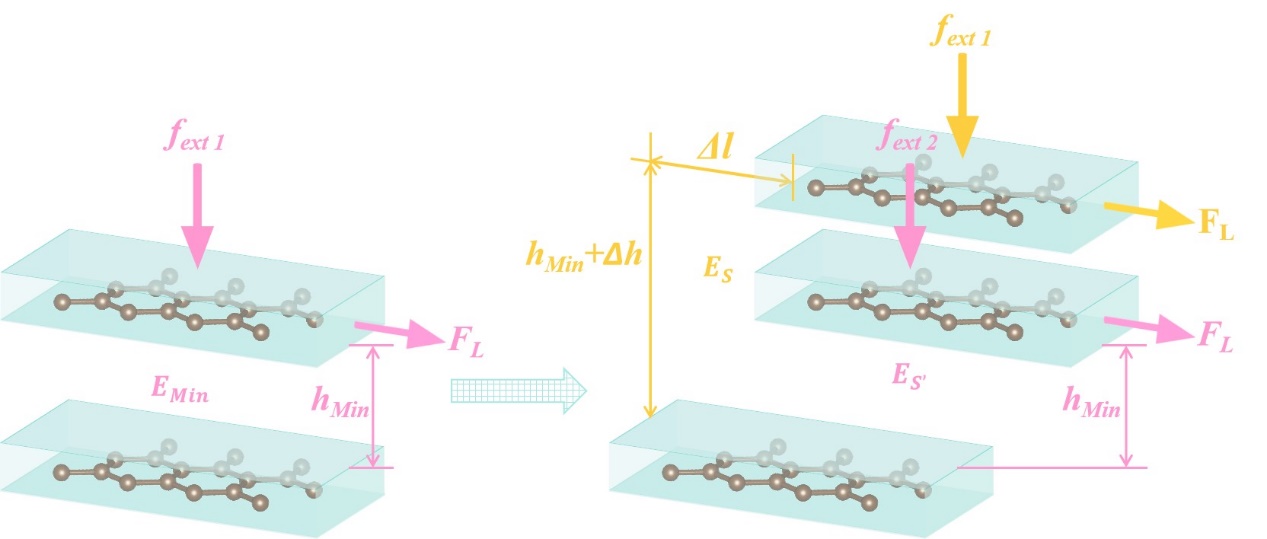 圖2 等載和等距滑動(dòng)過程中界面受力示意圖?;瑒?dòng)過程中的能量最小點(diǎn)(左)和鞍點(diǎn)(右)。黃色和粉色標(biāo)記分別表示等載和等距滑動(dòng)過程的界面信息