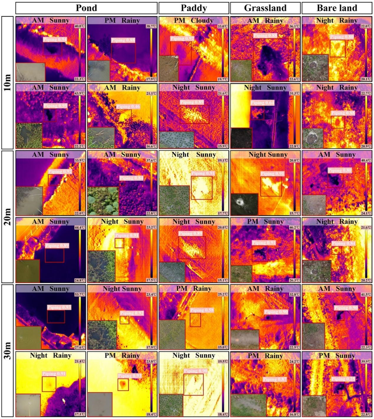 此外,研究還驗(yàn)證了模型在暴雨、夜間及植被遮擋場(chǎng)景下的魯棒性,為全天候監(jiān)測(cè)提供支撐。其突出優(yōu)勢(shì)表現(xiàn)為:一是全天候適應(yīng)性。熱紅外成像突破可見光局限,可探測(cè)植被或水體下隱蔽險(xiǎn)情隱患,夜間及雨天仍保持高精度。二是高效實(shí)時(shí)性。邊緣計(jì)算使無人機(jī)在飛行中即時(shí)分析數(shù)據(jù),減少數(shù)據(jù)傳輸延遲,顯著提升了應(yīng)急響應(yīng)速度。三是場(chǎng)景普適性。模型在長(zhǎng)江、淮河、鄱陽(yáng)湖等不同地質(zhì)條件的堤防段均表現(xiàn)優(yōu)異,具備大范圍推廣的潛力。四是模式革新從“人巡”到“機(jī)巡”的轉(zhuǎn)型,大幅降低人力成本與安全風(fēng)險(xiǎn),推動(dòng)了防汛作業(yè)智能化。