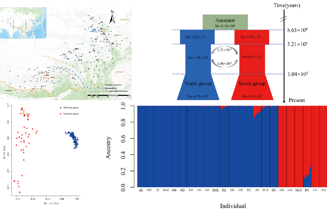 肉果草的群體遺傳結(jié)構(gòu)(紅色代表南方群體,藍色代表北方群體)
