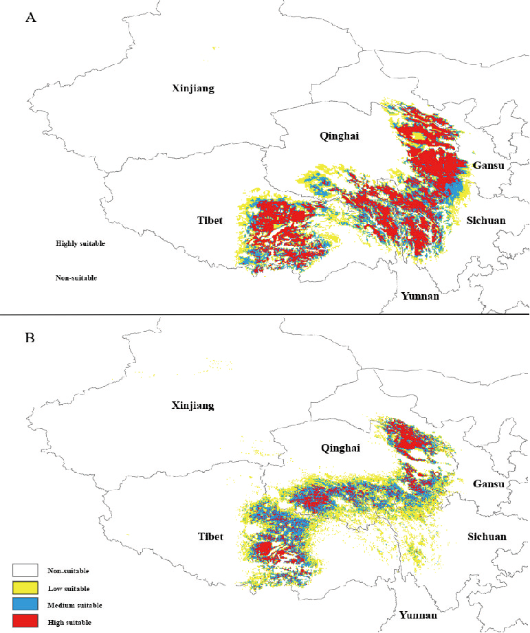 當(dāng)前(A)和未來全球變暖(B)情景下肉果草的潛在分布情況