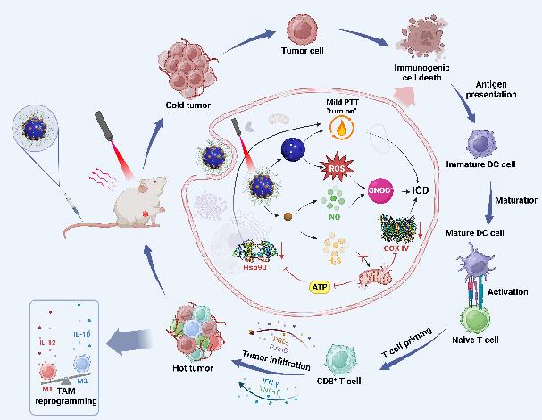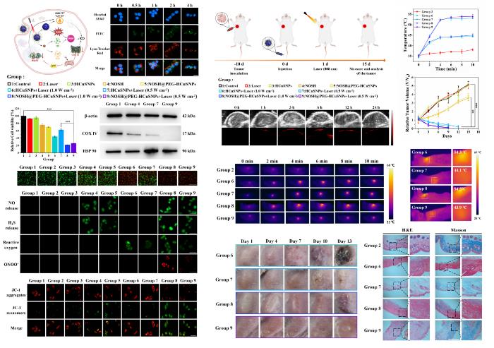 該研究利用雙模態(tài)探針和熒光-質(zhì)譜成像聯(lián)用動態(tài)可視化技術(shù),揭示了三重協(xié)同抗腫瘤的作用機制。結(jié)果表明,利用納米馬達,通過中空硫化銅納米顆粒HCuSNPs負載氣體信號分子供體NOSH,在808 nm激光照射下可控釋放H?S/NO,同時高效轉(zhuǎn)換光能(光熱轉(zhuǎn)化效率達27.8%),確保局部溫度維持在45℃以下,既能殺傷腫瘤細胞,又避免正常組織損傷。此外,該納米馬達不僅通過H?S阻斷線粒體能量代謝、NO-ROS反應(yīng)生成ONOO?雙路徑誘導腫瘤凋亡,還可顯著重塑腫瘤免疫微環(huán)境,促進M1型巨噬細胞極化(比例提升3倍)、CTLs浸潤(增加5倍),全面提升免疫抗癌能力。