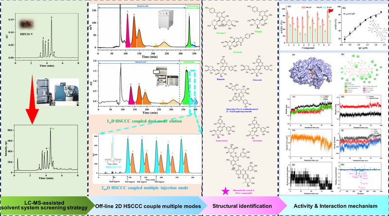 中國科學(xué)院西北高原生物研究所高原藏藥資源質(zhì)控與藥理毒理評價研究團隊通過建立離線二維高速逆流色譜結(jié)合雙模式洗脫與重復(fù)進樣連續(xù)洗脫的分離技術(shù),成功從唐古特大黃葉中分離得到1個亞甲基橋接的黃酮苷新型二聚體(Rheumbisflavonoid A)、3個黃酮碳苷和5個黃酮氧苷。Rheumbisflavonoid A的α-葡萄糖苷酶抑制活性顯著高于其余8個化合物。通過多維度的分子相互作用研究發(fā)現(xiàn),該化合物與α-葡萄糖苷酶具有高的結(jié)合常數(shù),通過范德華力和氫鍵作用占據(jù)α-葡萄糖苷酶的活性位點并形成穩(wěn)定的復(fù)合物,改變關(guān)鍵氨基酸殘基和多肽骨架的微環(huán)境,使埋藏的疏水環(huán)境暴露。此外,該化合物與α-葡萄糖苷酶結(jié)合后顯著降低其α-螺旋含量,從而使酶失去催化活性。該研究為復(fù)雜天然產(chǎn)物的分離純化及其與α-葡萄糖苷酶的相互作用機制提供了新的思路。
