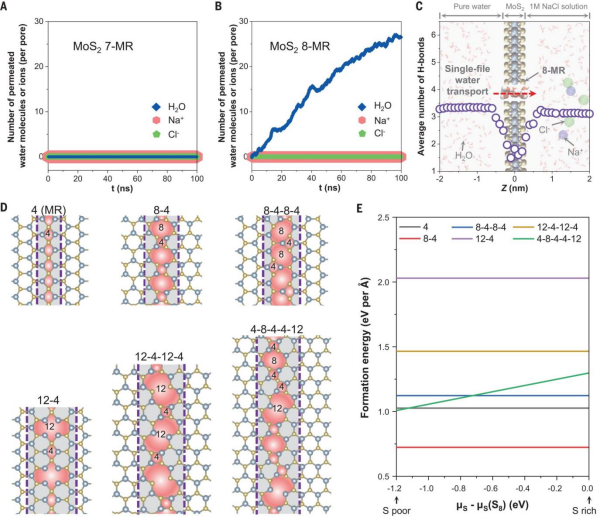 研究團(tuán)隊(duì)結(jié)合分子動(dòng)力學(xué)模擬和密度泛函理論計(jì)算,揭示了單層MoS?晶界處形成的八元環(huán)(8-MR)孔結(jié)構(gòu)的尺寸篩分效應(yīng),該孔徑能夠允許單鏈水分子快速通過,同時(shí)完全阻止水合離子(如Na?和Cl?)的通過。因此,單層MoS?晶界處形成的八元環(huán)(8-MR)孔結(jié)構(gòu)可以作為分子篩,有效分離水和離子。實(shí)驗(yàn)過程中,研究團(tuán)隊(duì)通過精確控制MoS?晶粒的生長(zhǎng)方向(固定0°或60°的相對(duì)取向),成功在大面積單層MoS?膜中實(shí)現(xiàn)了豐富的8-MR孔結(jié)構(gòu)。通過進(jìn)一步調(diào)節(jié)晶粒生長(zhǎng)時(shí)間、硫蒸氣壓力等參數(shù),實(shí)現(xiàn)了對(duì)晶粒尺寸和晶界密度的精確調(diào)控。優(yōu)化后的MoS?膜在多種測(cè)試條件下展現(xiàn)出優(yōu)異的性能,如高水滲透性、高離子選擇性以及良好的機(jī)械和化學(xué)穩(wěn)定性。這使得其在海水淡化、污水處理等領(lǐng)域具有廣闊的應(yīng)用前景,為二維材料在分離膜領(lǐng)域的應(yīng)用提供了新的思路。該方法不僅能夠精確控制孔結(jié)構(gòu),還能實(shí)現(xiàn)大面積連續(xù)膜的制備,具有重要的實(shí)際應(yīng)用價(jià)值。