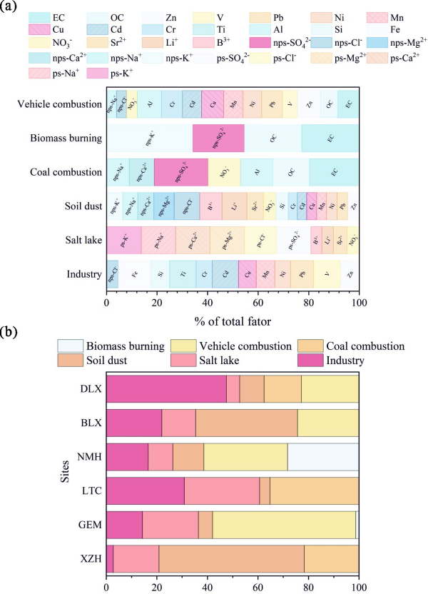 研究表明,柴達(dá)木盆地大氣降塵中石鹽和石膏的含量范圍為 0 至 47 wt%,鹽塵沉積通量(SDF)在 0 至 2.54 g/m2·30d 之間變化,其主要可溶性離子包括nps-SO42?、ps-Cl??和ps-Na+。不同采樣點(diǎn)的ps和nps組分的分布趨勢(shì)與可溶性離子相似,ps-Na+和ps-Cl–占比分別為49.52±34.59%和58.14±40.02%,表明鹽湖排放顯著影響降塵成分。源解析結(jié)果顯示,鹽湖排放貢獻(xiàn)了降塵來(lái)源的 5.23% ~ 29.76%,顯示了鹽湖來(lái)源的粉塵對(duì)大氣降塵具有不可忽視的重要貢獻(xiàn)。