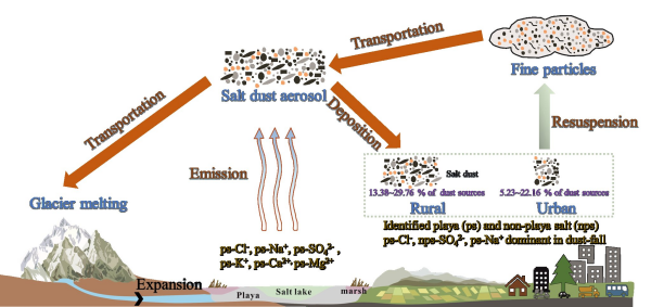 研究表明,鹽塵可能是內(nèi)陸地區(qū)Na?和Cl?離子的重要來(lái)源,尤其是在春季和冬季,西北風(fēng)將大量鹽塵輸送到下游地區(qū),甚至影響到東亞和更廣泛區(qū)域的空氣質(zhì)量。此外,鹽塵的排放可能形成一個(gè)區(qū)域正反饋循環(huán):鹽塵加劇了冰川的消融,冰川融化則增加了河流徑流量,進(jìn)而擴(kuò)大了鹽湖及周邊鹽漬土的范圍,從而導(dǎo)致更多的鹽塵釋放到大氣中并進(jìn)一步加速冰川融化。這一認(rèn)識(shí)對(duì)全球生態(tài)安全和水資源管理具有重要啟示意義。這項(xiàng)研究系統(tǒng)評(píng)估了鹽塵排放對(duì)大氣顆粒物沉積的貢獻(xiàn),揭示了鹽塵在區(qū)域及全球氣候環(huán)境變化中的潛在作用。根據(jù)本研究結(jié)果,建議在全球變暖背景下,未來(lái)制訂環(huán)境政策和構(gòu)建氣候模型時(shí)需要更多地關(guān)注內(nèi)陸鹽湖粉塵的影響。