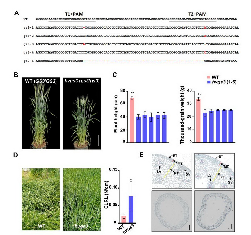Gγ亞基在多種生物過程中發(fā)揮著重要作用,但其在大麥中的具體功能尚未完全明確。為了深入研究這一問題,中國科學院西北高原生物研究所高原作物種質資源創(chuàng)新與利用研究團隊利用CRISPR/Cas9技術敲除大麥品種Golden Promise中的HvGS3基因,并通過詳細的表型分析比較了突變體hvgs3與野生型之間的株高、穗長和千粒重等農藝性狀。結果顯示,突變體hvgs3的株高比野生型降低了37.8%至43.1%,同時倒二節(jié)的抗倒伏指數提高了76.6%。進一步分析發(fā)現,突變體hvgs3的莖節(jié)細胞長度顯著縮短,導致株高降低。突變體hvgs3的木質素合成通路被激活,木質素含量比野生型增加了22%,基部第二節(jié)間的維管束數量、機械組織厚度均高于野生型,從而增強了莖稈的機械強度。通過CRISPR/Cas9技術成功敲除HvGS3基因,我們創(chuàng)制了一種具有矮化和抗倒伏特性的大麥新種質資源,株高的降低和莖稈強度的增加共同提升了其抗倒伏性能。該研究不僅揭示了大麥HvGS3基因的功能,還為培育抗倒伏、高產的大麥品種提供了寶貴的理論依據和技術支持。